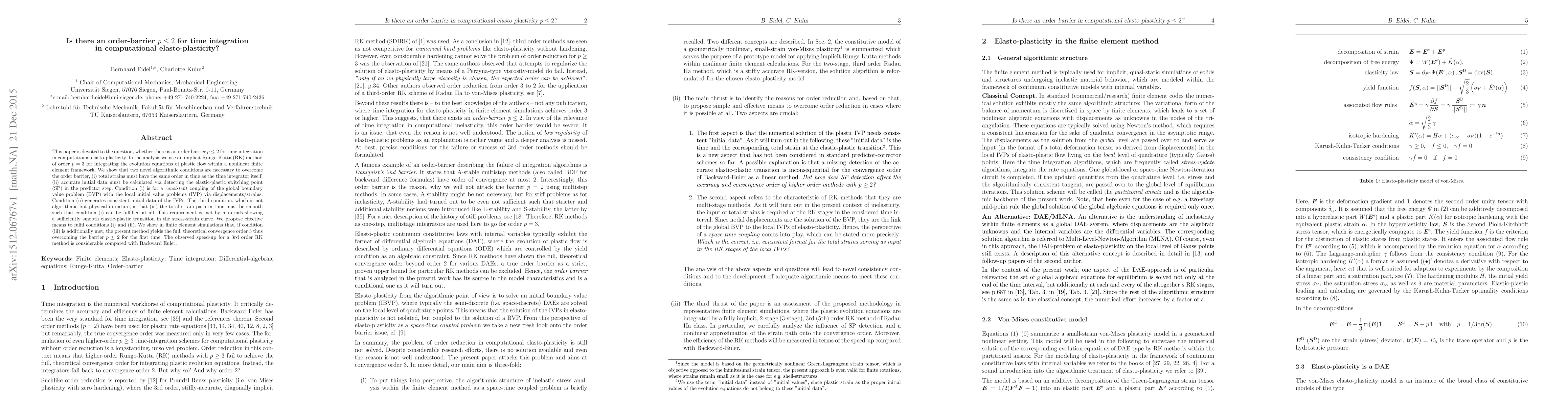 This paper is devoted to the question, whether there is an order barrier $p\leq2$ for time integration in computational elasto-plasticity. In the analysis we use an implicit Runge-Kutta (RK) method of order $p=3$ for integrating the evolution equations of plastic flow within a nonlinear finite element framework. We show that two novel algorithmic conditions are necessary to overcome the order barrier, (i) total strains must have the same order in time as the time integrator itself, (ii) accurate initial data must be calculated via detecting the elastic-plastic switching point (SP) in the predictor step. Condition (i) is for a \emph{consistent} coupling of the global boundary value problem (BVP) with the local initial value problems (IVP) via displacements/strains. Condition (ii) generates consistent initial data of the IVPs. The third condition, which is not algorithmic but physical in nature, is that (iii) the total strain path in time must be smooth such that condition (i) can be fulfilled at all. This requirement is met by materials showing a sufficiently smooth elastic-plastic transition in the stress-strain curve. We propose effective means to fulfil conditions (i) and (ii). We show in finite element simulations that, if condition (iii) is additionally met, the present method yields the full, theoretical convergence order 3 thus overcoming the barrier $p\leq 2$ for the first time. The observed speed-up for a 3rd order RK method is considerable compared with Backward Euler.