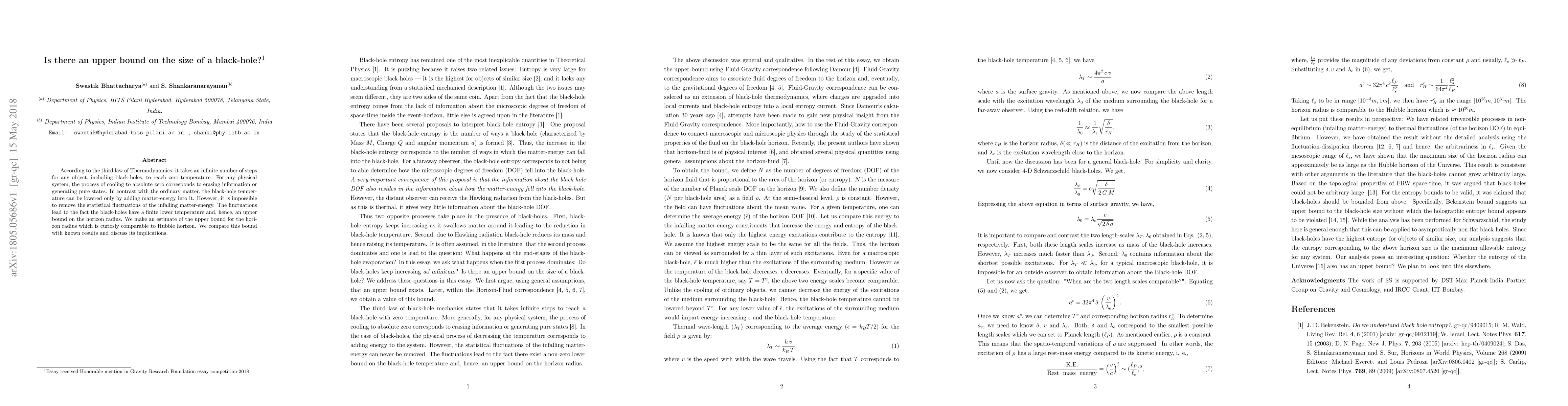 This paper explores whether black holes have an upper bound on their size, suggesting that due to statistical fluctuations in infalling matter-energy, black holes cannot reach absolute zero temperature, leading to an upper limit on their horizon radius, comparable to the Hubble horizon. The implications of this bound are discussed in relation to existing theoretical frameworks.