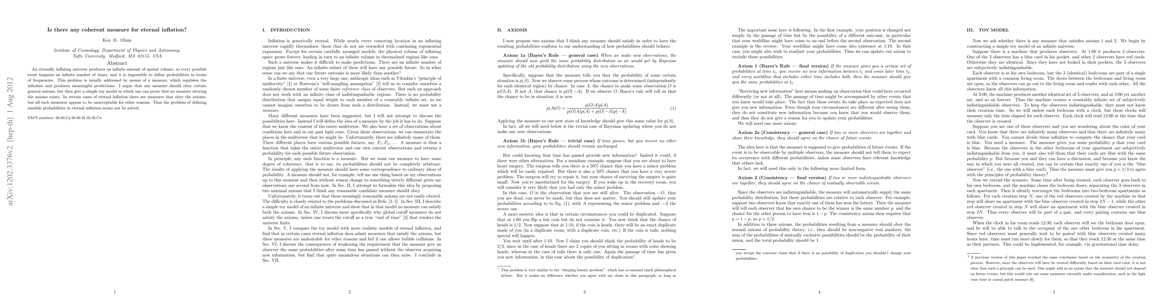 The paper explores the challenge of defining a coherent measure for eternal inflation, where infinite volumes and events complicate probability definitions. The author argues that no measure satisfying general axioms can exist, though some measures do exist, they are problematic, leaving the issue unresolved.