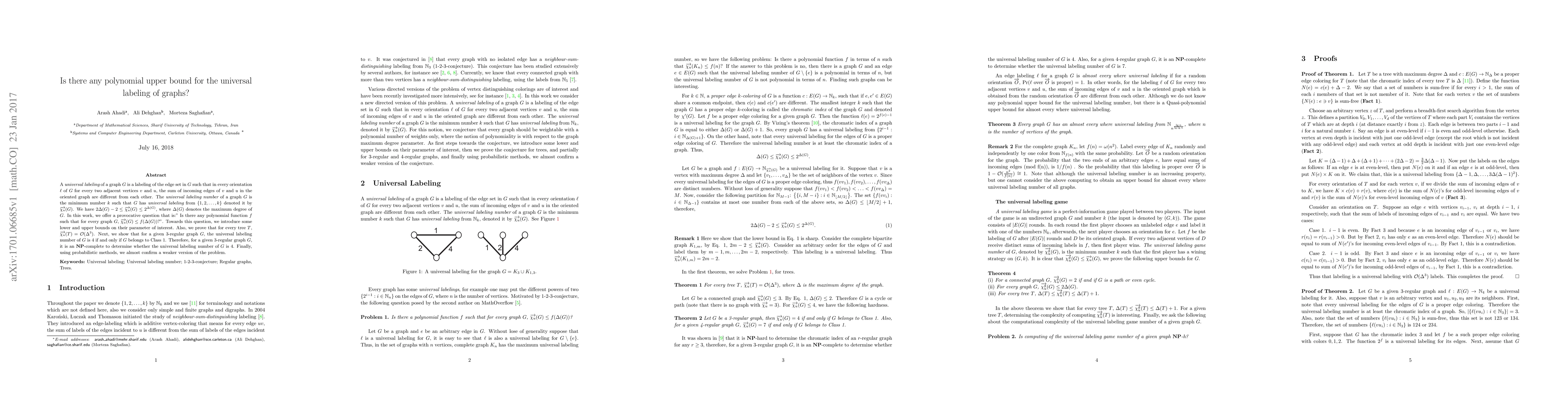 A {\it universal labeling} of a graph $G$ is a labeling of the edge set in $G$ such that in every orientation $\ell$ of $G$ for every two adjacent vertices $v$ and $u$, the sum of incoming edges of $v$ and $u$ in the oriented graph are different from each other. The {\it universal labeling number} of a graph $G$ is the minimum number $k$ such that $G$ has {\it universal labeling} from $\{1,2,\ldots, k\}$ denoted it by $\overrightarrow{\chi_{u}}(G) $. We have $2\Delta(G)-2 \leq \overrightarrow{\chi_{u}} (G)\leq 2^{\Delta(G)}$, where $\Delta(G)$ denotes the maximum degree of $G$. In this work, we offer a provocative question that is:" Is there any polynomial function $f$ such that for every graph $G$, $\overrightarrow{\chi_{u}} (G)\leq f(\Delta(G))$?". Towards this question, we introduce some lower and upper bounds on their parameter of interest. Also, we prove that for every tree $T$, $\overrightarrow{\chi_{u}}(T)=\mathcal{O}(\Delta^3) $. Next, we show that for a given 3-regular graph $G$, the universal labeling number of $G$ is 4 if and only if $G$ belongs to Class 1. Therefore, for a given 3-regular graph $G$, it is an $ \mathbf{NP} $-complete to determine whether the universal labeling number of $G$ is 4. Finally, using probabilistic methods, we almost confirm a weaker version of the problem.
