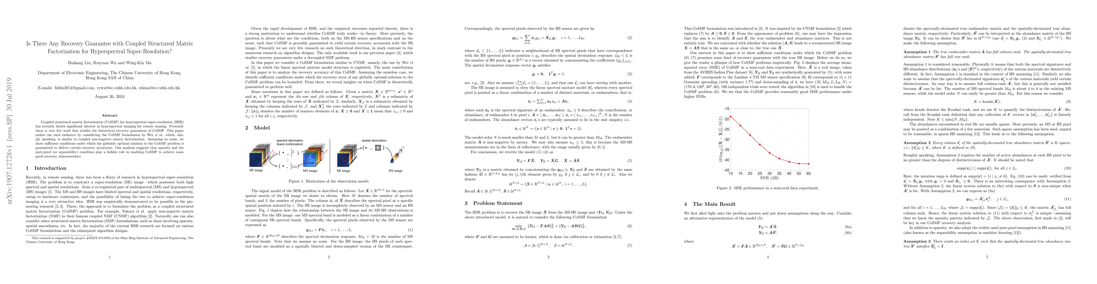 This paper investigates the theoretical recovery guarantees of coupled structured matrix factorization (CoSMF) for hyperspectral super-resolution (HSR). It establishes sufficient conditions under which CoSMF can achieve optimal recovery, highlighting the roles of sparsity and pure-pixel conditions.