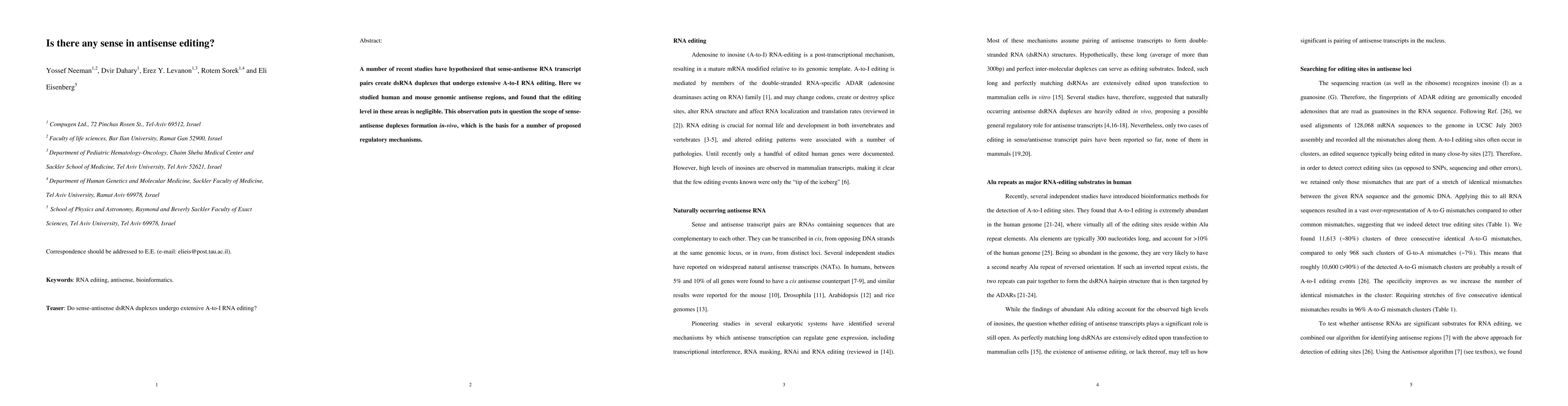 A study found negligible RNA editing in human and mouse antisense regions, questioning proposed regulatory mechanisms based on sense-antisense duplexes formation.