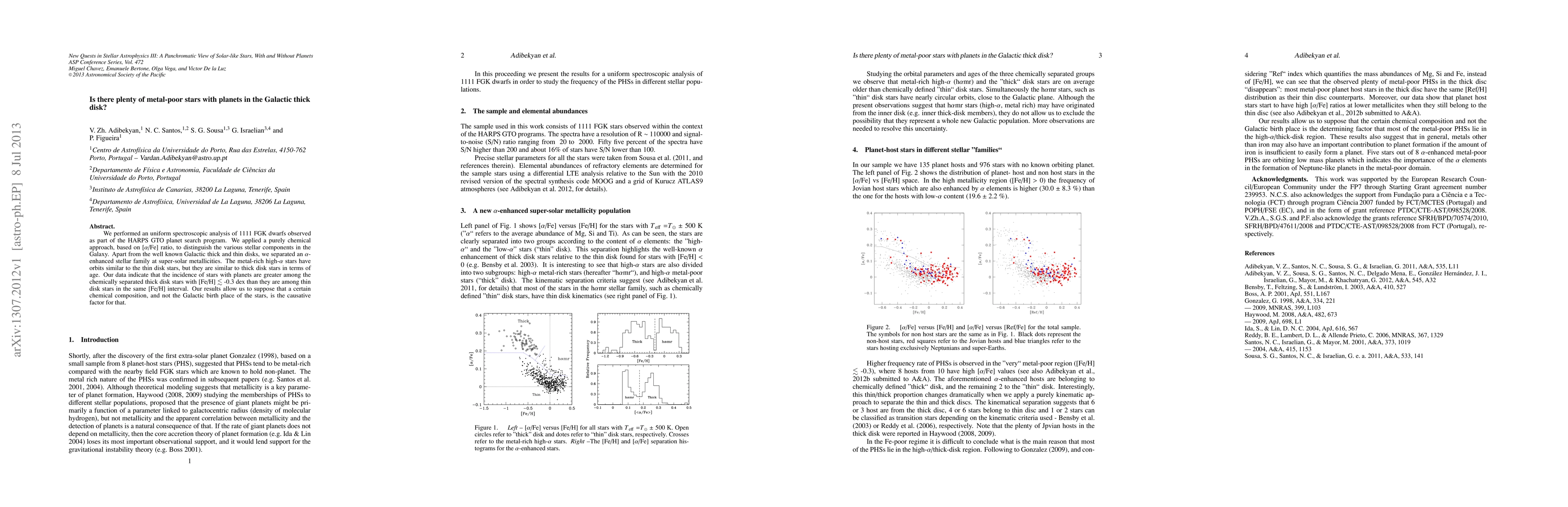 We performed an uniform spectroscopic analysis of 1111 FGK dwarfs observed as part of the HARPS GTO planet search program. We applied a purely chemical approach, based on [alpha/Fe] ratio, to distinguish the various stellar components in the Galaxy. Apart from the well known Galactic thick and thin disks, we separated an alpha-enhanced stellar family at super-solar metallicities. The metal-rich high-alpha stars have orbits similar to the thin disk stars, but they are similar to thick disk stars in terms of age. Our data indicate that the incidence of stars with planets are greater among the chemically separated thick disk stars with [Fe/H] < -0.3 dex than they are among thin disk stars in the same [Fe/H] interval. Our results allow us to suppose that a certain chemical composition, and not the Galactic birth place of the stars, is the causative factor for that.