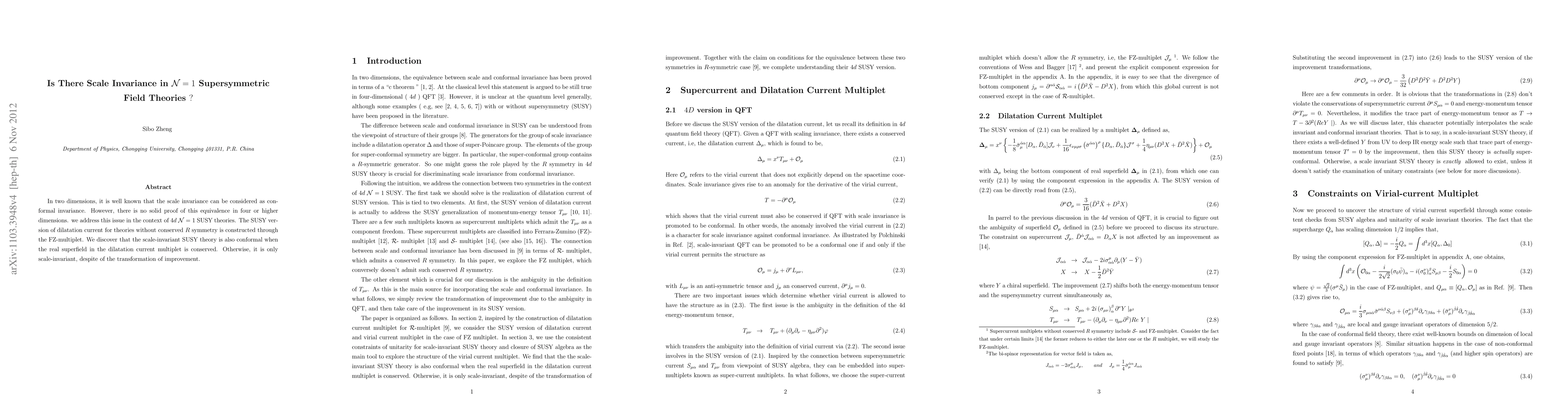 In two dimensions, it is well known that the scale invariance can be considered as conformal invariance. However, there is no solid proof of this equivalence in four or higher dimensions. We address this issue in the context of 4d $\mathcal{N}=1$ SUSY theories. The SUSY version of dilatation current for theories without conserved $R$ symmetry is constructed through the FZ-multiplet. We discover that the scale-invariant SUSY theory is also conformal when the real superfield in the dilatation current multiplet is conserved. Otherwise, it is only scale-invariant, despite of the transformation of improvement.