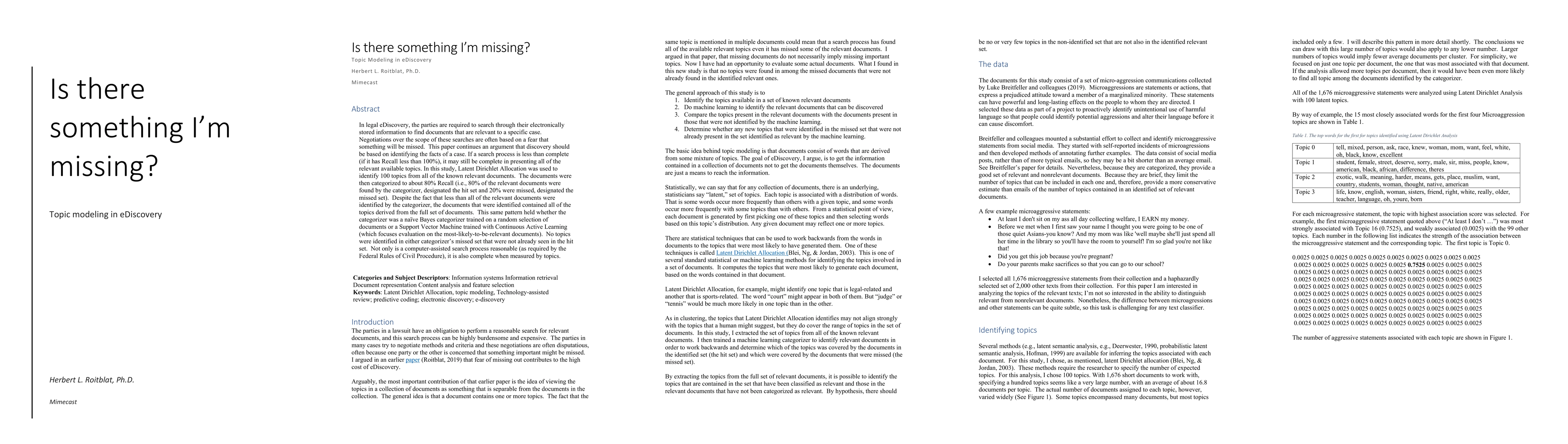 In legal eDiscovery, the parties are required to search through their electronically stored information to find documents that are relevant to a specific case. Negotiations over the scope of these searches are often based on a fear that something will be missed. This paper continues an argument that discovery should be based on identifying the facts of a case. If a search process is less than complete (if it has Recall less than 100%), it may still be complete in presenting all of the relevant available topics. In this study, Latent Dirichlet Allocation was used to identify 100 topics from all of the known relevant documents. The documents were then categorized to about 80% Recall (i.e., 80% of the relevant documents were found by the categorizer, designated the hit set and 20% were missed, designated the missed set). Despite the fact that less than all of the relevant documents were identified by the categorizer, the documents that were identified contained all of the topics derived from the full set of documents. This same pattern held whether the categorizer was a na\"ive Bayes categorizer trained on a random selection of documents or a Support Vector Machine trained with Continuous Active Learning (which focuses evaluation on the most-likely-to-be-relevant documents). No topics were identified in either categorizer's missed set that were not already seen in the hit set. Not only is a computer-assisted search process reasonable (as required by the Federal Rules of Civil Procedure), it is also complete when measured by topics.