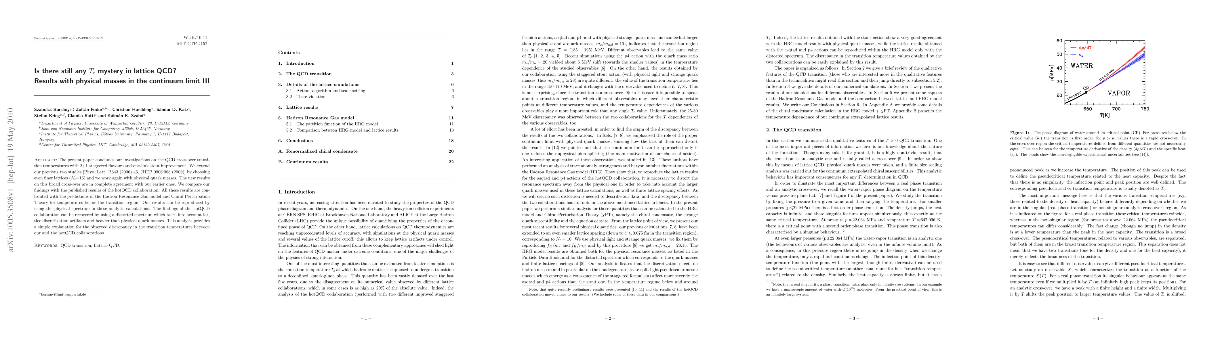 The present paper concludes our investigations on the QCD cross-over transition temperatures with 2+1 staggered flavours and one-link stout improvement. We extend our previous two studies [Phys. Lett. B643 (2006) 46, JHEP 0906:088 (2009)] by choosing even finer lattices ($N_t$=16) and we work again with physical quark masses. The new results on this broad cross-over are in complete agreement with our earlier ones. We compare our findings with the published results of the hotQCD collaboration. All these results are confronted with the predictions of the Hadron Resonance Gas model and Chiral Perturbation Theory for temperatures below the transition region. Our results can be reproduced by using the physical spectrum in these analytic calculations. The findings of the hotQCD collaboration can be recovered by using a distorted spectrum which takes into account lattice discretization artifacts and heavier than physical quark masses. This analysis provides a simple explanation for the observed discrepancy in the transition temperatures between our and the hotQCD collaborations.