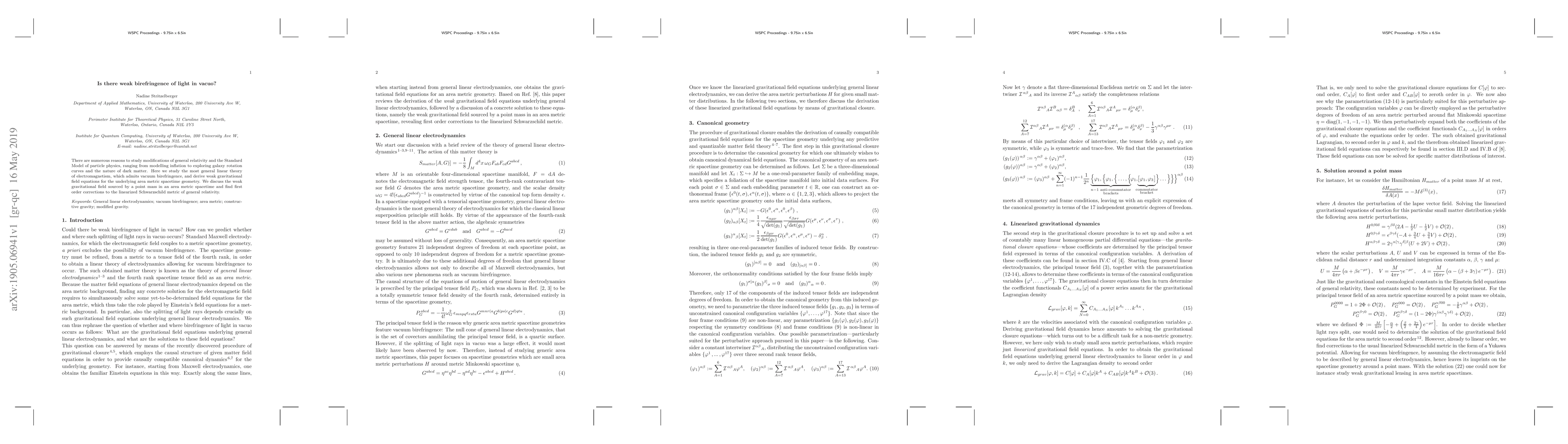 There are numerous reasons to study modifications of general relativity and the Standard Model of particle physics, ranging from modelling inflation to exploring galaxy rotation curves and the nature of dark matter. Here we study the most general linear theory of electromagnetism, which admits vacuum birefringence, and derive weak gravitational field equations for the underlying area metric spacetime geometry. We discuss the weak gravitational field sourced by a point mass in an area metric spacetime and find first order corrections to the linearized Schwarzschild metric of general relativity.