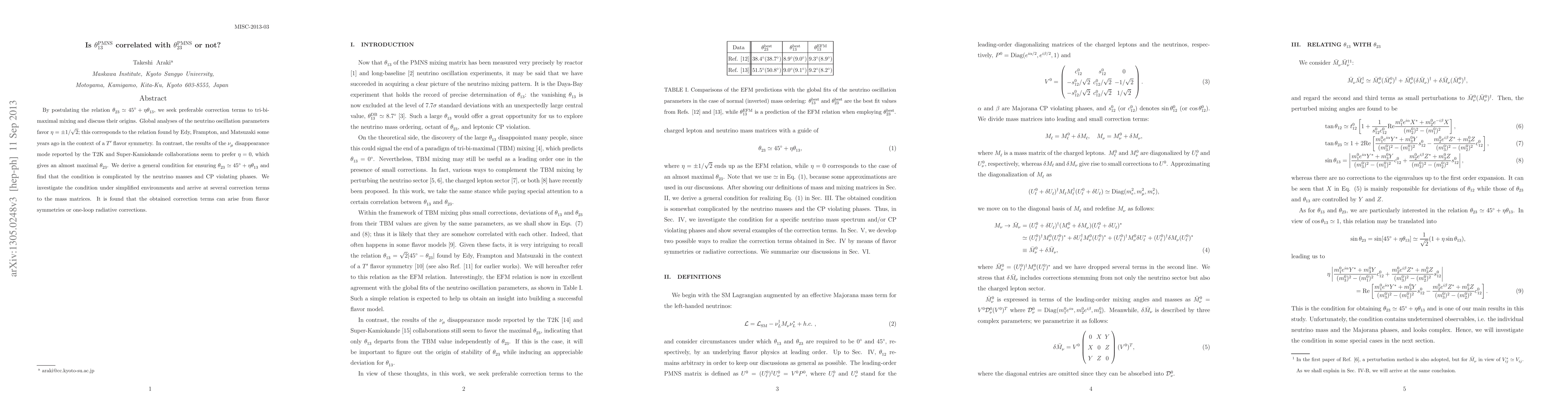 This paper explores the correlation between \theta_{13} and \theta_{23} in the PMNS matrix, proposing a relation \theta_{23} \simeq 45^\circ + \eta\theta_{13} and analyzing its origins. It finds that global neutrino oscillation data favors \eta=\pm 1/\sqrt{2}, while experimental results prefer \eta=0, suggesting different implications for the mixing angles.