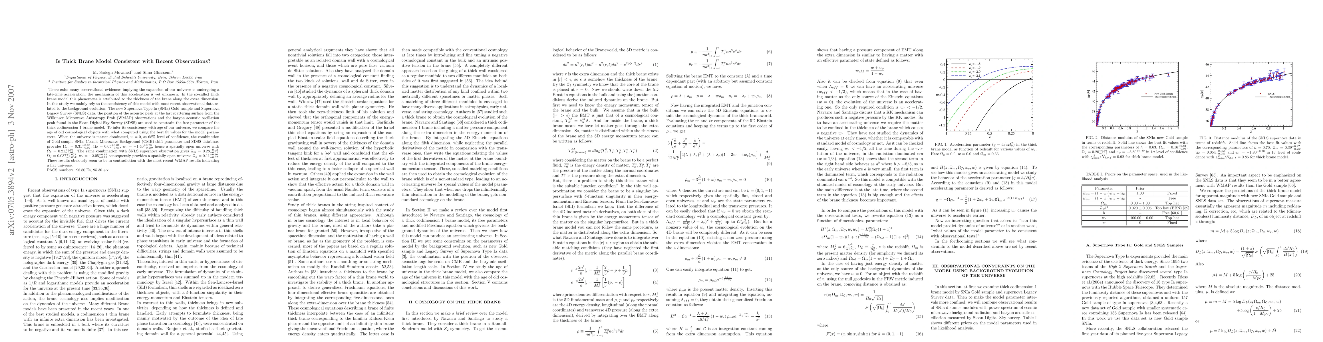 There exist many observational evidences implying the expansion of our universe is undergoing a late-time acceleration, the mechanism of this acceleration is yet unknown. In the so-called thick brane model this phenomena is attributed to the thickness of the brane along the extra dimension. In this study we mainly rely to the consistency of this model with most recent observational data related to the background evolution. The new Supernova Type Ia (SNIa) Gold sample and Supernova Legacy Survey (SNLS) data, the position of the acoustic peak at the last scattering surface from the WMAP observations and the baryon acoustic oscillation peak found in the Sloan Digital Sky Survey (SDSS) are used to constrain the free parameter of the thick codimension 1 brane model. To infer its consistency with age of our universe, we compare the age of old cosmological objects with what computed using the best fit values for the model parameters. When the universe is matter dominated, $w=0$, at 68% level of confidence, the combination of Gold sample SNIa, CMB shift parameter and SDSS databases provides $\Omega_m=0.31_{-0.02}^{+0.02}$, $\Omega_{\cal{C}}=0.05_{-0.01}^{+0.01}$, $w_r=-1.40_{-0.20}^{+0.20}$, hence a spatially open universe with $\Omega_k=0.21_{-0.08}^{+0.08}$. The same combination with SNLS supernova observation gives $\Omega_m=0.28_{-0.02}^{+0.03}$, $\Omega_{\cal{C}}=0.037_{-0.004}^{+0.003}$, $w_r=-2.05_{-0.15}^{+0.15}$ consequently provides a spatially open universe $\Omega_k=0.11_{-0.07}^{+0.10}$. These results obviously seem to be in contradiction with the most recent WMAP results indicating a flat universe.