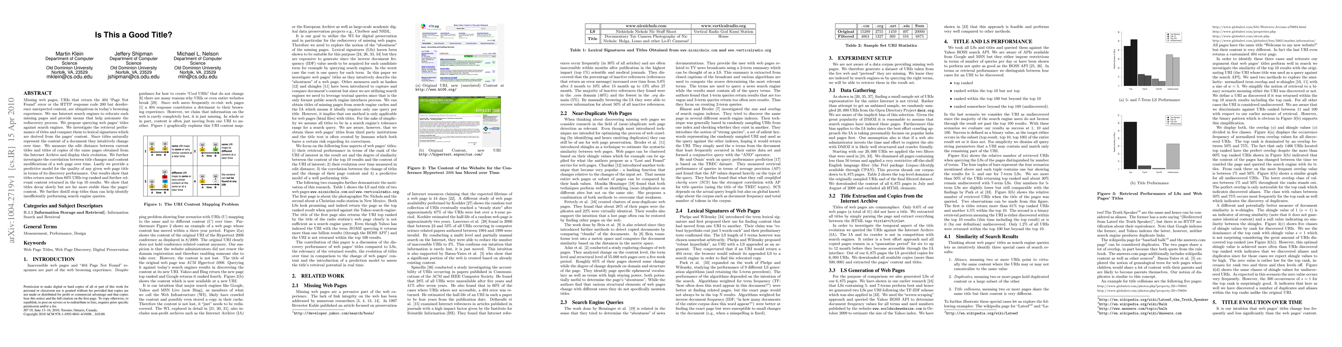 This paper investigates the effectiveness of using web page titles to relocate lost or modified web pages via search engines, demonstrating that titles outperform lexical signatures derived from page content. It also explores the correlation between title changes and content modifications, concluding that titles are more stable and provide better discovery performance.