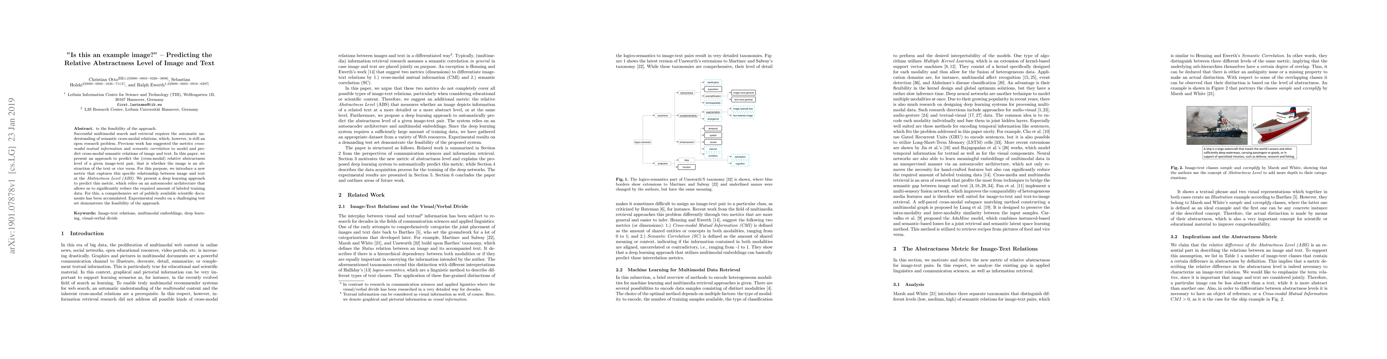 Successful multimodal search and retrieval requires the automatic understanding of semantic cross-modal relations, which, however, is still an open research problem. Previous work has suggested the metrics cross-modal mutual information and semantic correlation to model and predict cross-modal semantic relations of image and text. In this paper, we present an approach to predict the (cross-modal) relative abstractness level of a given image-text pair, that is whether the image is an abstraction of the text or vice versa. For this purpose, we introduce a new metric that captures this specific relationship between image and text at the Abstractness Level (ABS). We present a deep learning approach to predict this metric, which relies on an autoencoder architecture that allows us to significantly reduce the required amount of labeled training data. A comprehensive set of publicly available scientific documents has been gathered. Experimental results on a challenging test set demonstrate the feasibility of the approach.