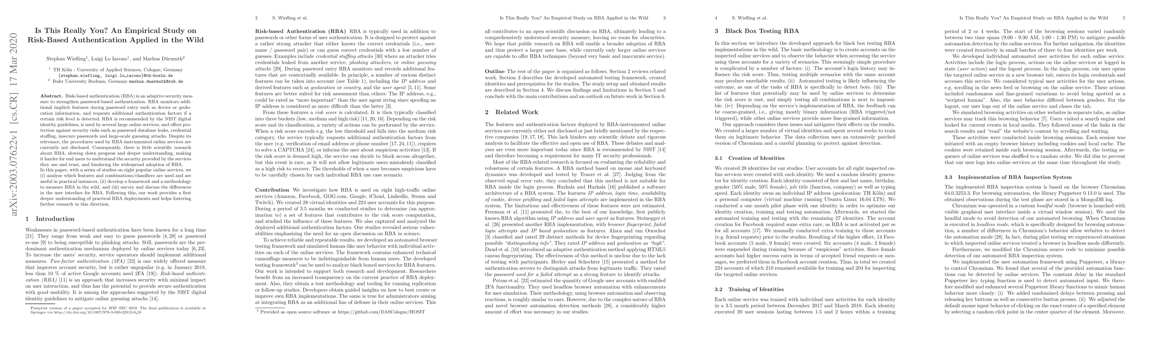 This paper investigates risk-based authentication (RBA) in popular online services through empirical studies, analyzing used features and their effectiveness, developing a framework to measure RBA, and discussing user interface differences. The study aims to enhance understanding and promote further research on RBA.