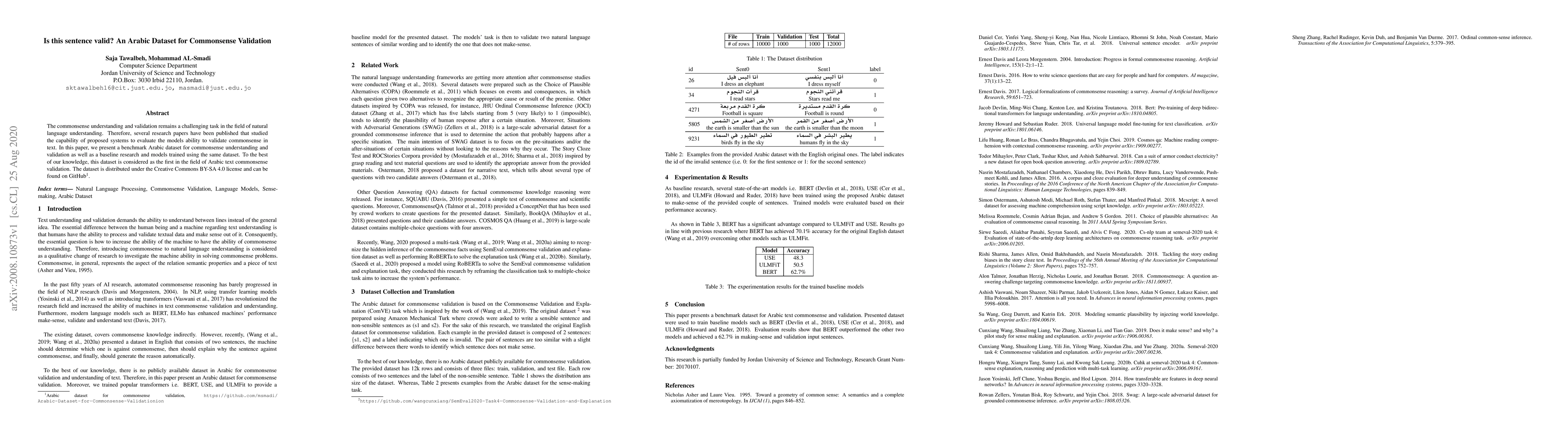This paper introduces a novel Arabic dataset aimed at validating commonsense understanding in text, along with baseline research and models trained on it, marking the first dataset in this specific area. The dataset is openly available under the Creative Commons BY-SA 4.0 license on GitHub.