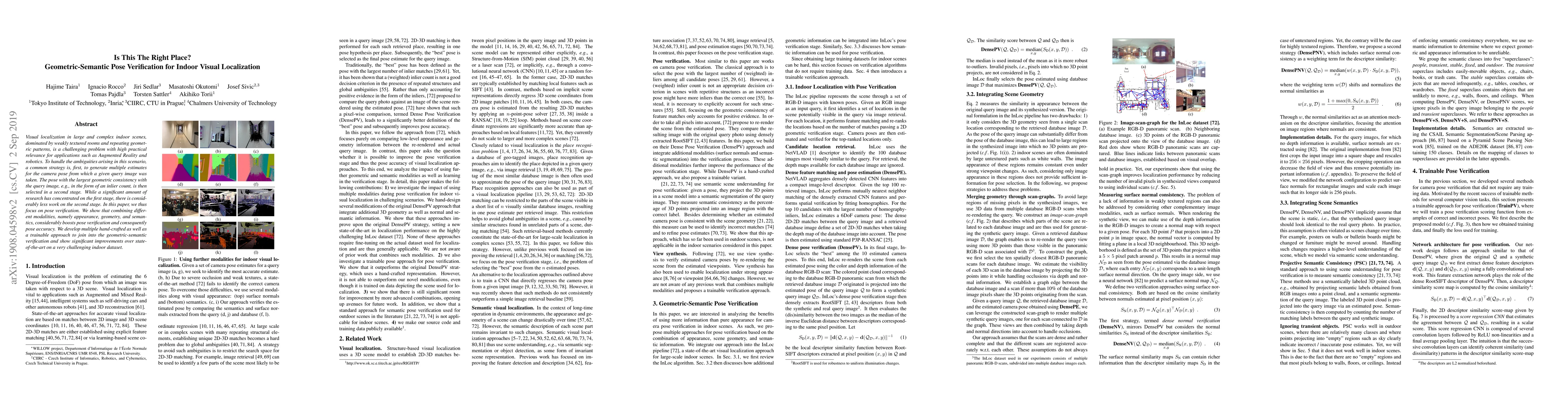 Visual localization in large and complex indoor scenes, dominated by weakly textured rooms and repeating geometric patterns, is a challenging problem with high practical relevance for applications such as Augmented Reality and robotics. To handle the ambiguities arising in this scenario, a common strategy is, first, to generate multiple estimates for the camera pose from which a given query image was taken. The pose with the largest geometric consistency with the query image, e.g., in the form of an inlier count, is then selected in a second stage. While a significant amount of research has concentrated on the first stage, there is considerably less work on the second stage. In this paper, we thus focus on pose verification. We show that combining different modalities, namely appearance, geometry, and semantics, considerably boosts pose verification and consequently pose accuracy. We develop multiple hand-crafted as well as a trainable approach to join into the geometric-semantic verification and show significant improvements over state-of-the-art on a very challenging indoor dataset.