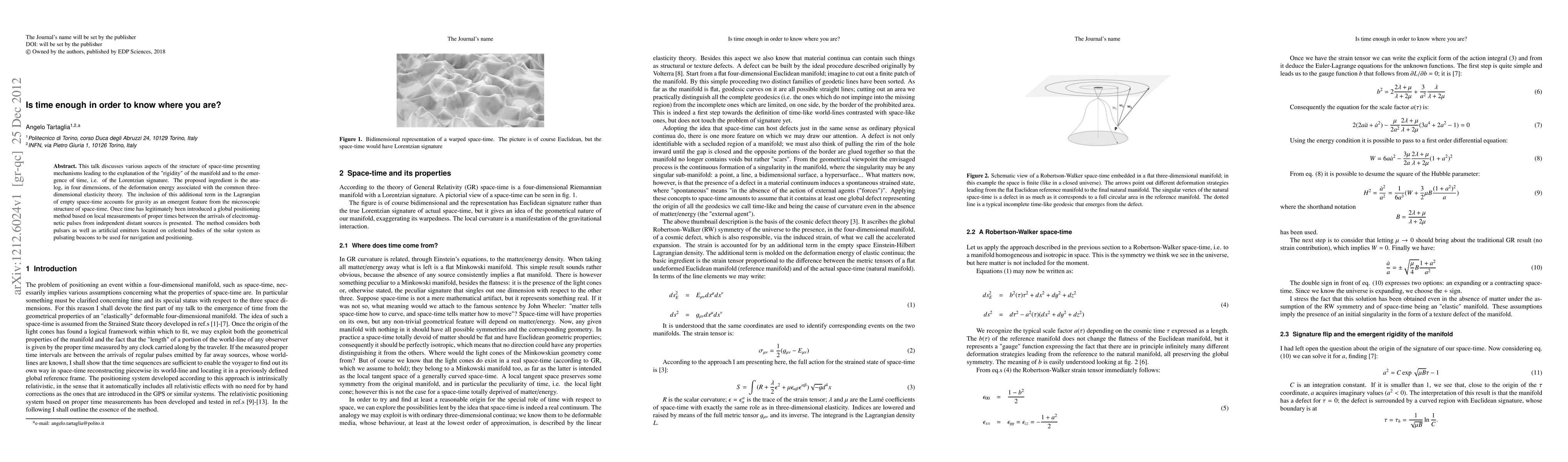 This talk discusses various aspects of the structure of space-time presenting mechanisms leading to the explanation of the "rigidity" of the manifold and to the emergence of time, i.e. of the Lorentzian signature. The proposed ingredient is the analog, in four dimensions, of the deformation energy associated with the common threedimensional elasticity theory. The inclusion of this additional term in the Lagrangian of empty space-time accounts for gravity as an emergent feature from the microscopic structure of space-time. Once time has legitimately been introduced, a global positioning method based on local measurements of proper times between the arrivals of electromagnetic pulses from independent distant sources is presented. The method considers both pulsars as well as artificial emitters located on celestial bodies of the solar system as pulsating beacons to be used for navigation and positioning.