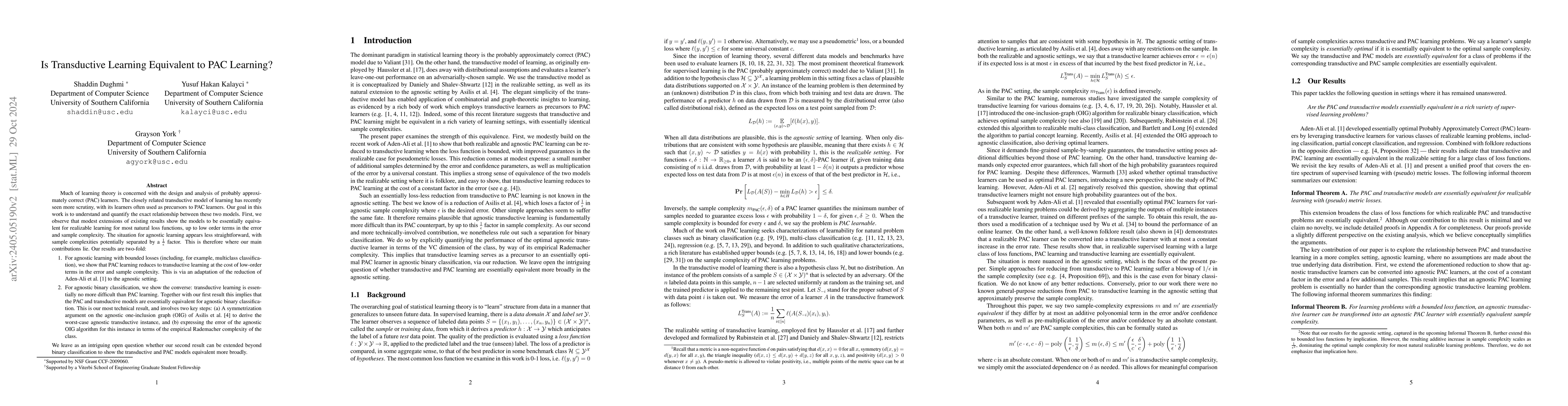 This paper demonstrates that transductive learning and Probably Approximately Correct (PAC) learning are equivalent under certain conditions, showing that agnostic PAC learning can be efficiently converted to agnostic transductive learning by adding a small number of samples. The authors propose an efficient reduction technique and show that it is essentially optimal for binary classification.