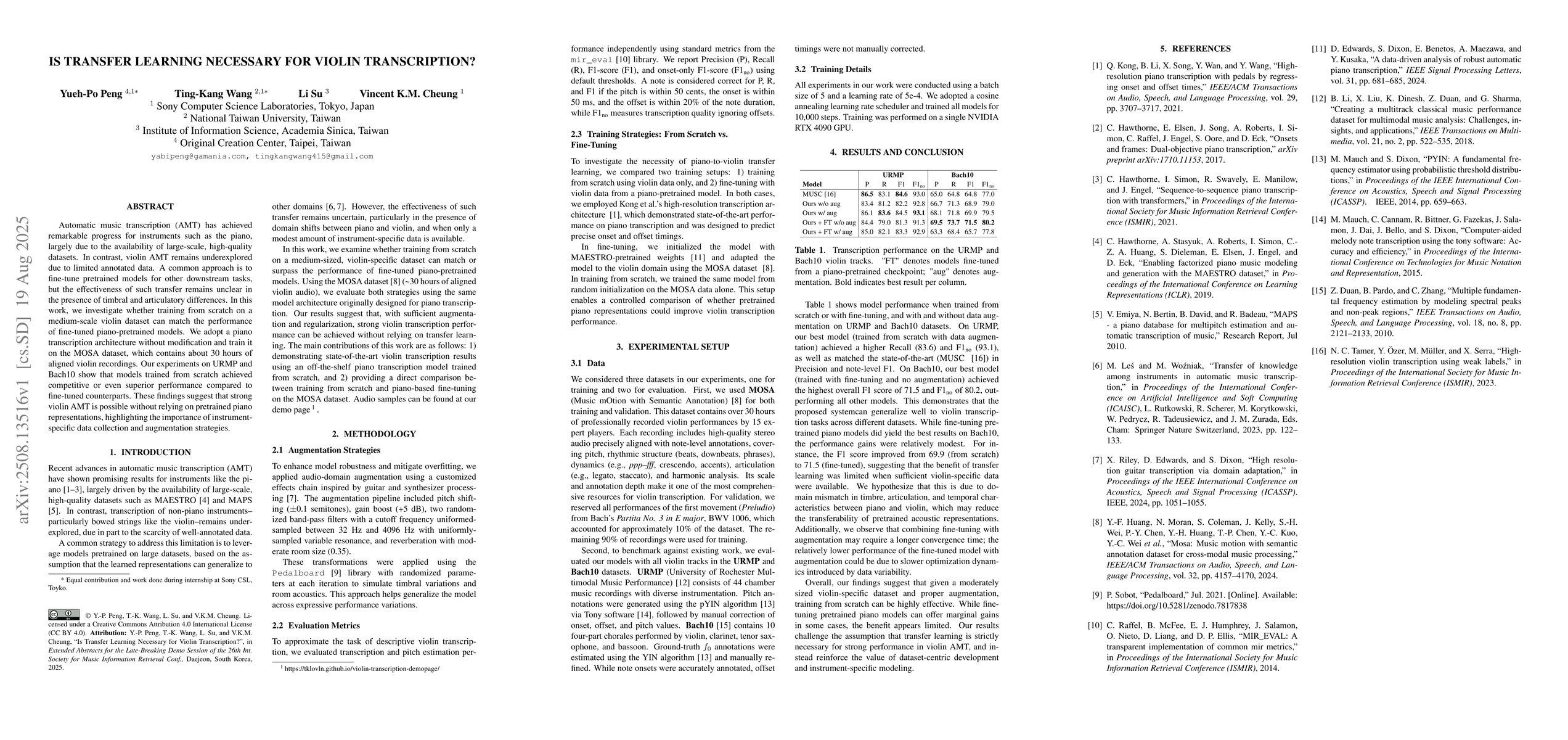Demonstrated state-of-the-art violin transcription results using an off-the-shelf piano transcription model trained from scratch and provided a direct comparison between training from scratch and piano-based fine-tuning on the MOSA dataset.