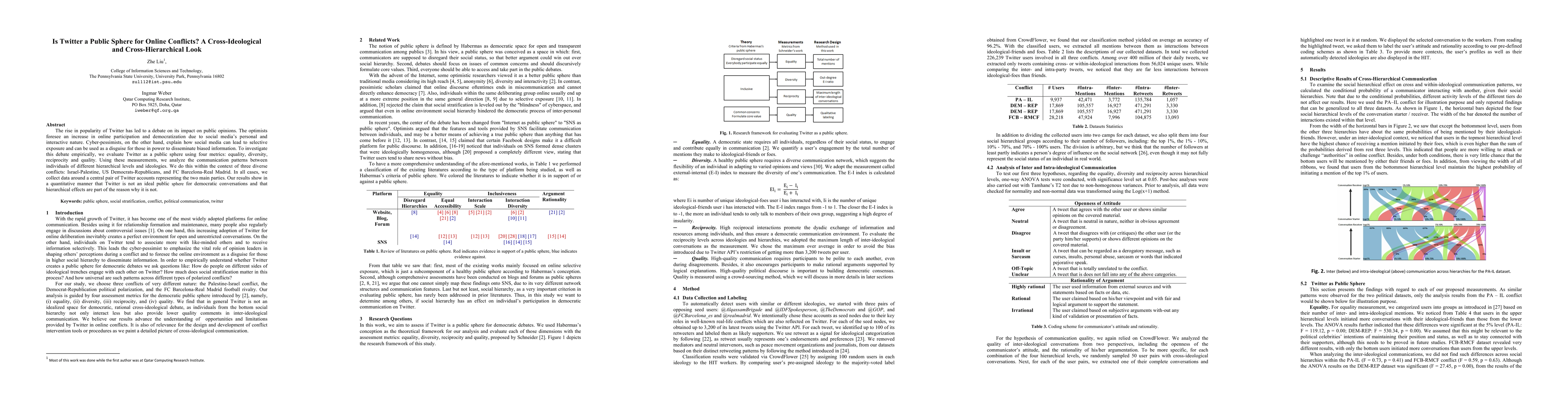 The rise in popularity of Twitter has led to a debate on its impact on public opinions. The optimists foresee an increase in online participation and democratization due to social media's personal and interactive nature. Cyber-pessimists, on the other hand, explain how social media can lead to selective exposure and can be used as a disguise for those in power to disseminate biased information. To investigate this debate empirically, we evaluate Twitter as a public sphere using four metrics: equality, diversity, reciprocity and quality. Using these measurements, we analyze the communication patterns between individuals of different hierarchical levels and ideologies. We do this within the context of three diverse conflicts: Israel-Palestine, US Democrats-Republicans, and FC Barcelona-Real Madrid. In all cases, we collect data around a central pair of Twitter accounts representing the two main parties. Our results show in a quantitative manner that Twitter is not an ideal public sphere for democratic conversations and that hierarchical effects are part of the reason why it is not.
