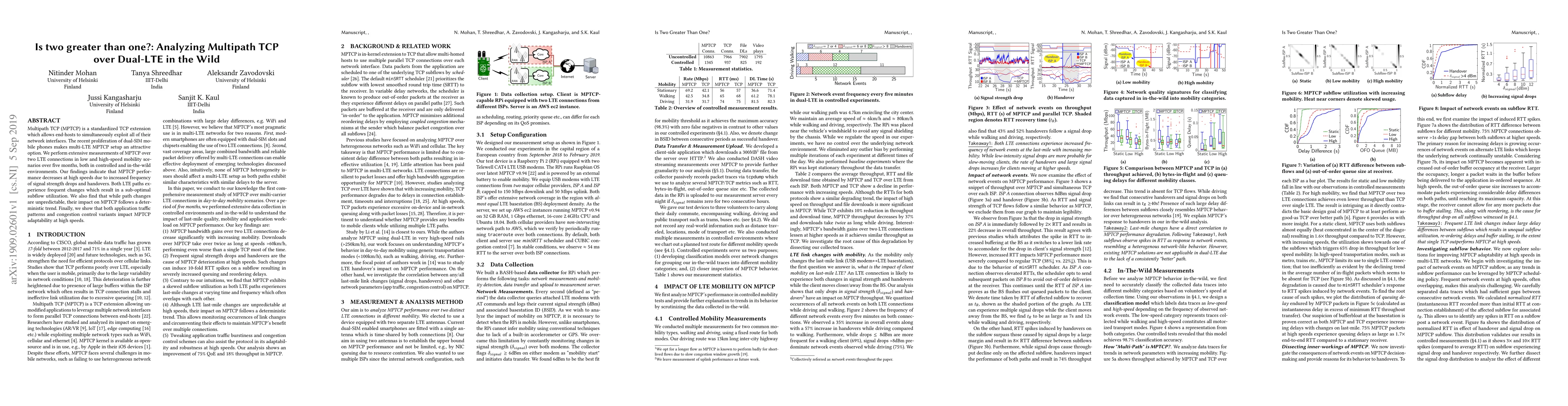 This paper investigates the performance of Multipath TCP (MPTCP) over dual-LTE connections in real-world conditions, finding that high-speed mobility leads to decreased performance due to frequent signal drops and handovers. The study concludes that while path changes are unpredictable, their impact on MPTCP follows a deterministic trend, and both traffic patterns and congestion control variants affect adaptability.