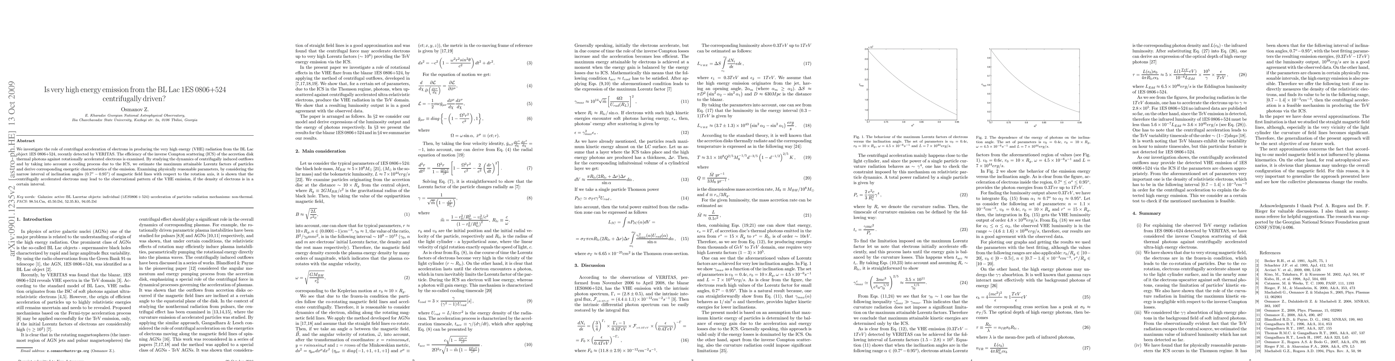 Research investigates whether high-energy emission from BL Lac 1ES 0806+524 is driven by centrifugal acceleration of electrons, finding that it may occur under specific conditions with certain electron density ranges.
