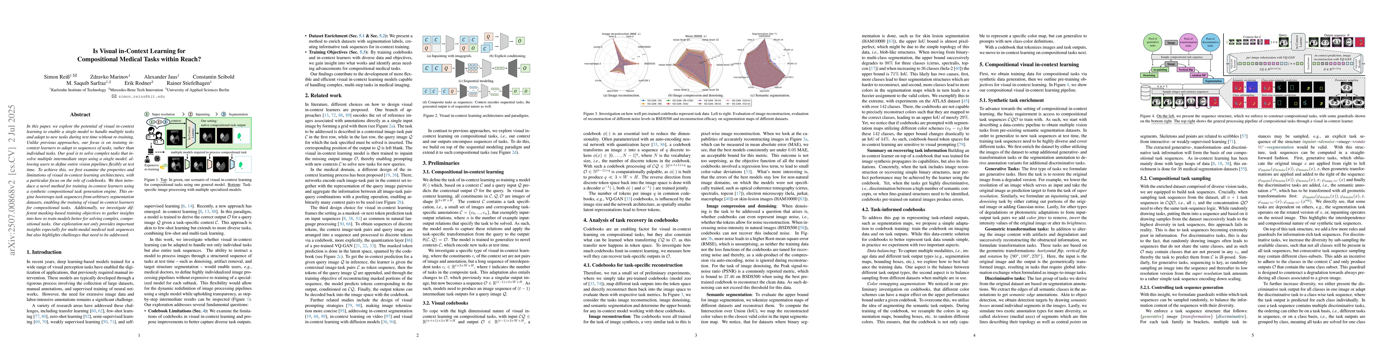 The paper explores visual in-context learning for compositional medical tasks, focusing on training models to adapt to sequences of tasks without re-training. It examines the properties and limitations of visual in-context learning architectures, particularly codebooks, and introduces a novel training method using a synthetic compositional task generation engine.