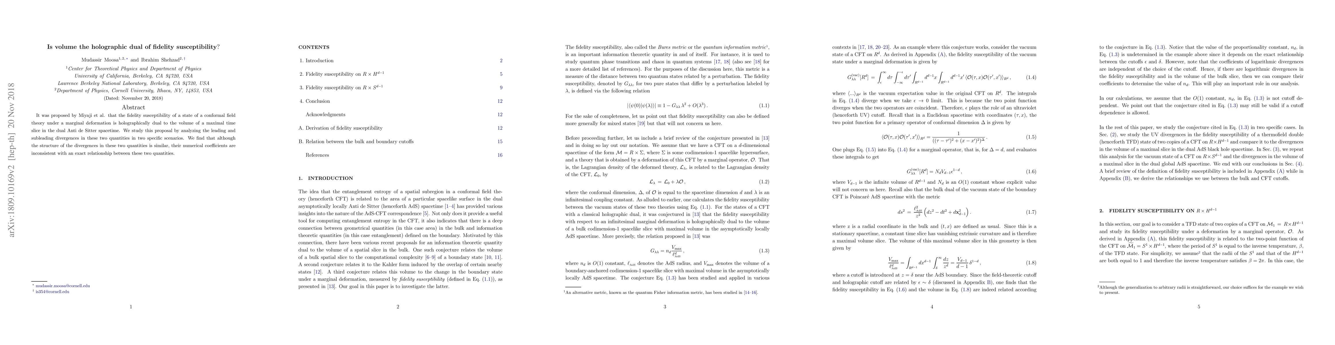 Researchers analyzed the proposed holographic dual relationship between fidelity susceptibility and volume in a conformal field theory, finding that numerical coefficients do not match the exact relationship predicted.