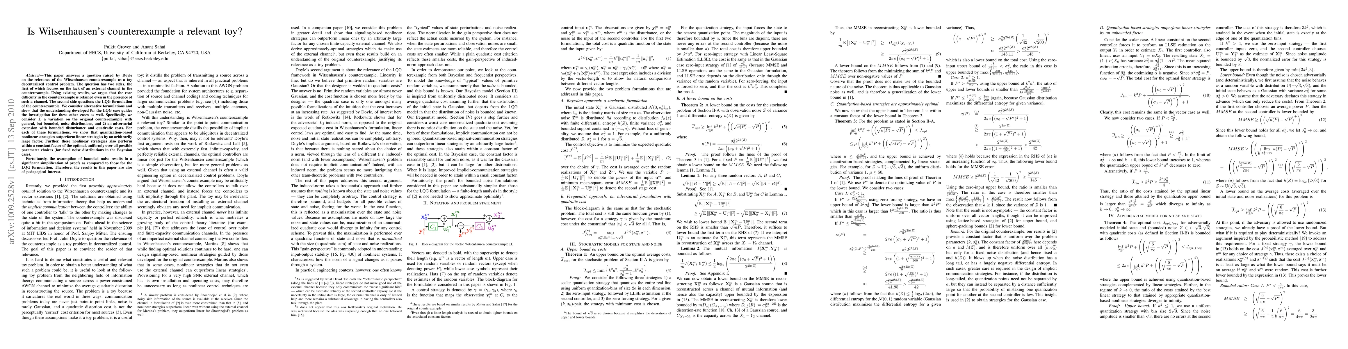 This paper answers a question raised by Doyle on the relevance of the Witsenhausen counterexample as a toy decentralized control problem. The question has two sides, the first of which focuses on the lack of an external channel in the counterexample. Using existing results, we argue that the core difficulty in the counterexample is retained even in the presence of such a channel. The second side questions the LQG formulation of the counterexample. We consider alternative formulations and show that the understanding developed for the LQG case guides the investigation for these other cases as well. Specifically, we consider 1) a variation on the original counterexample with general, but bounded, noise distributions, and 2) an adversarial extension with bounded disturbance and quadratic costs. For each of these formulations, we show that quantization-based nonlinear strategies outperform linear strategies by an arbitrarily large factor. Further, these nonlinear strategies also perform within a constant factor of the optimal, uniformly over all possible parameter choices (for fixed noise distributions in the Bayesian case). Fortuitously, the assumption of bounded noise results in a significant simplification of proofs as compared to those for the LQG formulation. Therefore, the results in this paper are also of pedagogical interest.