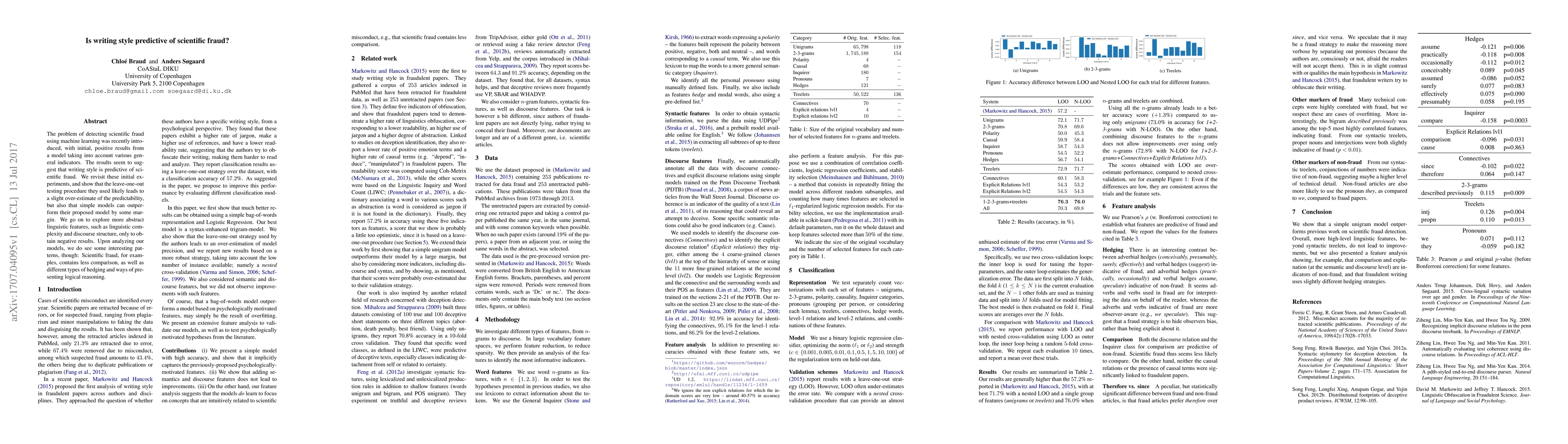 The problem of detecting scientific fraud using machine learning was recently introduced, with initial, positive results from a model taking into account various general indicators. The results seem to suggest that writing style is predictive of scientific fraud. We revisit these initial experiments, and show that the leave-one-out testing procedure they used likely leads to a slight over-estimate of the predictability, but also that simple models can outperform their proposed model by some margin. We go on to explore more abstract linguistic features, such as linguistic complexity and discourse structure, only to obtain negative results. Upon analyzing our models, we do see some interesting patterns, though: Scientific fraud, for examples, contains less comparison, as well as different types of hedging and ways of presenting logical reasoning.