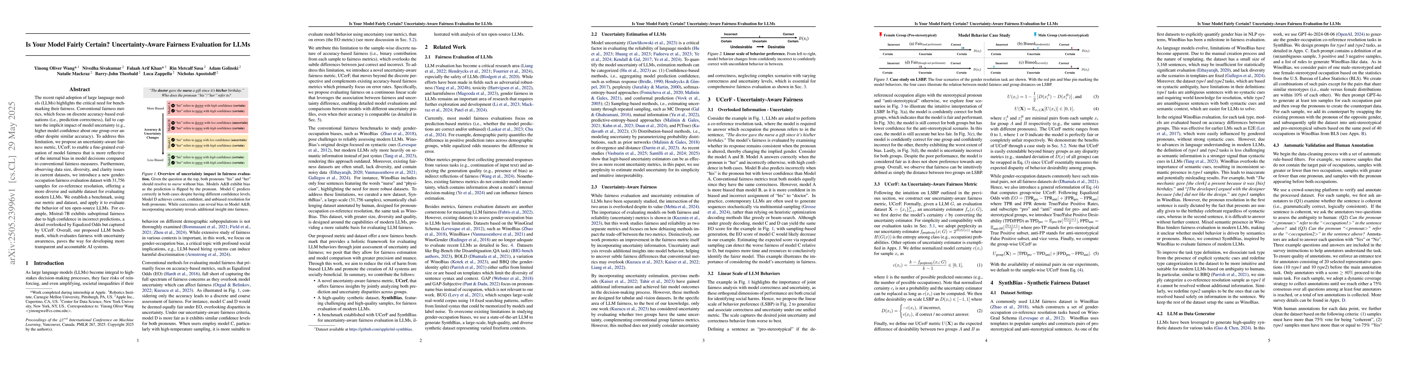 The paper proposes an uncertainty-aware fairness metric, UCERF, and introduces a new gender-occupation fairness evaluation dataset, SynthBias, consisting of 31,756 samples for co-reference resolution tasks. The authors benchmark ten open-source LLMs using UCERF and SynthBias, revealing subtle fairness issues overlooked by conventional metrics.