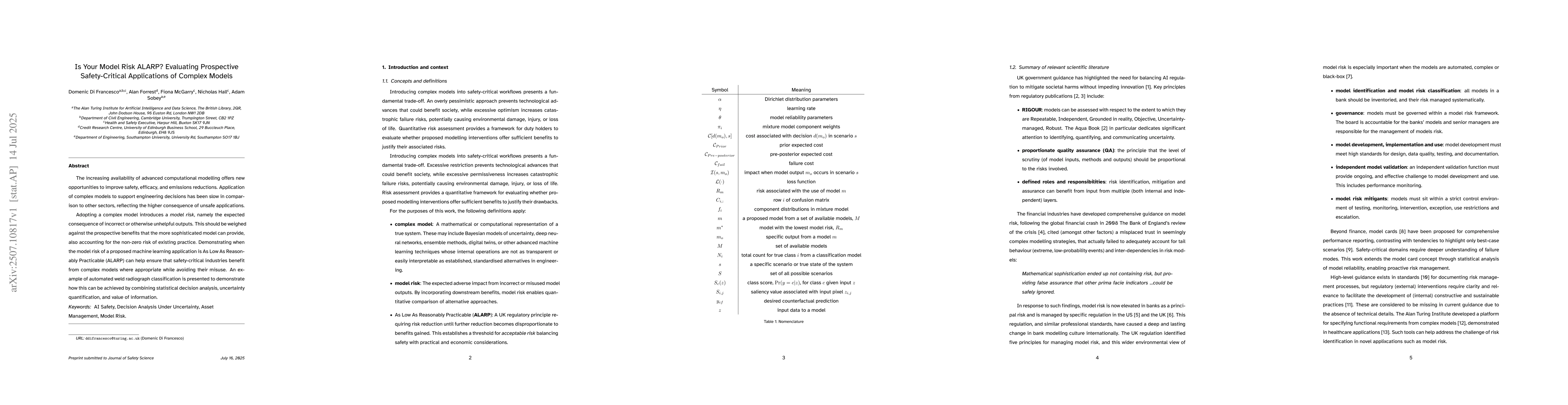 The paper proposes a framework for evaluating model risk in safety-critical applications using complex models, illustrated with automated weld radiograph classification. It combines statistical decision analysis, uncertainty quantification, and value of information (VoI) analysis.