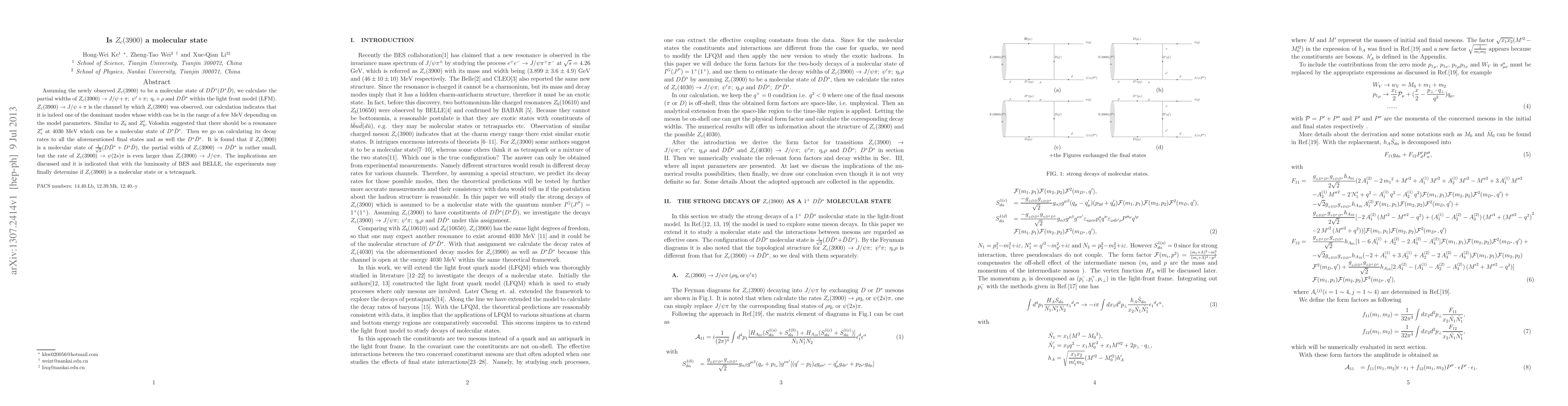 Assuming the newly observed $Z_c(3900)$ to be a molecular state of $D\bar D^*(D^{*} \bar D)$, we calculate the partial widths of $Z_c(3900)\to J/\psi+\pi;\; \psi'+\pi;\; \eta_c+\rho$ and $D\bar D^*$ within the light front model (LFM). $Z_c(3900)\to J/\psi+\pi$ is the channel by which $Z_c(3900)$ was observed, our calculation indicates that it is indeed one of the dominant modes whose width can be in the range of a few MeV depending on the model parameters. Similar to $Z_b$ and $Z_b'$, Voloshin suggested that there should be a resonance $Z_c'$ at 4030 MeV which can be a molecular state of $D^*\bar D^*$. Then we go on calculating its decay rates to all the aforementioned final states and as well the $D^*\bar D^*$. It is found that if $Z_c(3900)$ is a molecular state of ${1\over\sqrt 2}(D\bar D^*+D^*\bar D)$, the partial width of $Z_c(3900)\to D\bar D^*$ is rather small, but the rate of $Z_c(3900)\to\psi(2s)\pi$ is even larger than $Z_c(3900)\to J/\psi\pi$. The implications are discussed and it is indicated that with the luminosity of BES and BELLE, the experiments may finally determine if $Z_c(3900)$ is a molecular state or a tetraquark.