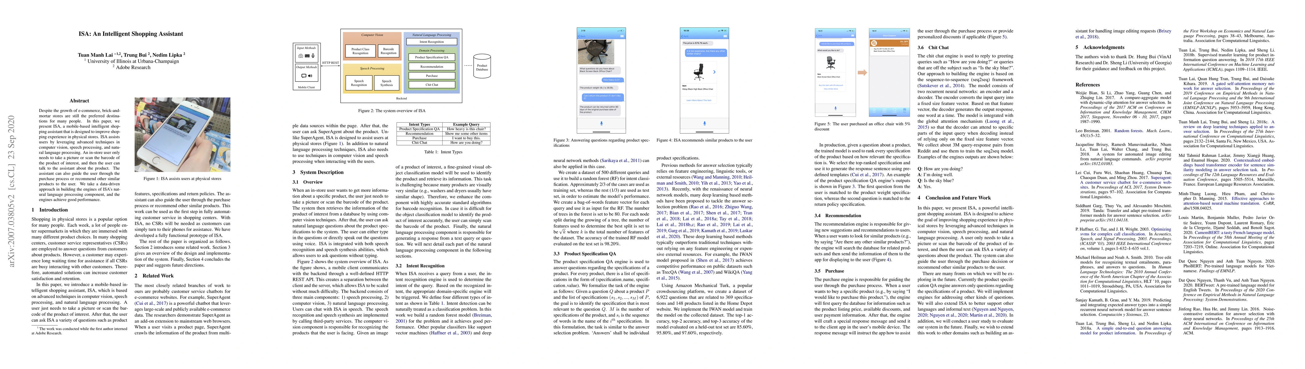 The paper introduces ISA, a mobile-based intelligent shopping assistant that enhances the in-store shopping experience using computer vision, speech processing, and natural language processing. ISA assists users by recommending products and guiding them through purchases, demonstrating effective performance in its natural language processing component.