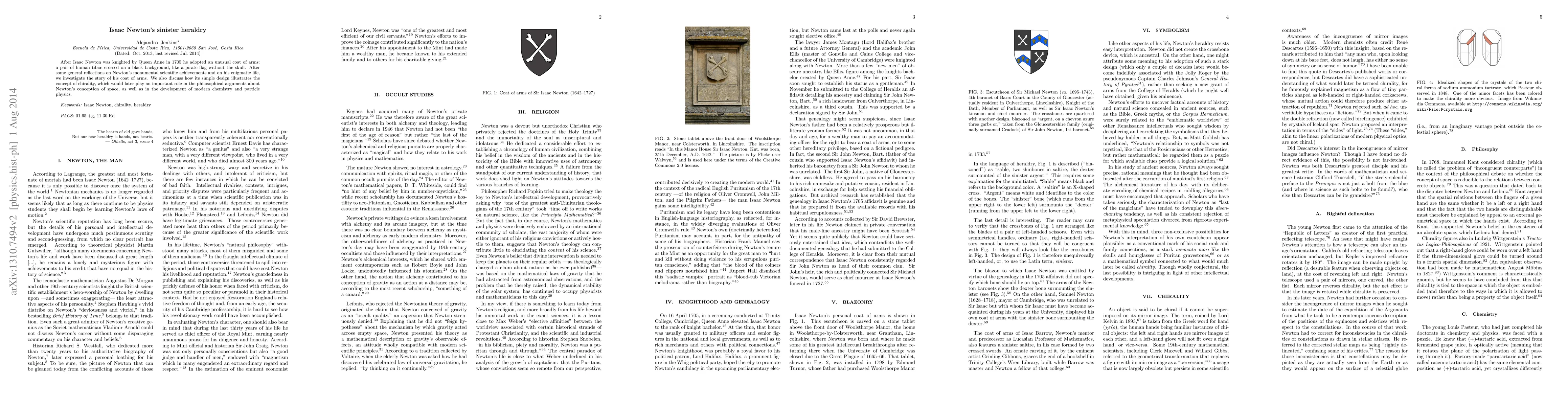This paper explores Isaac Newton's unusual coat of arms featuring crossed human tibiae on a black background after his knighthood, linking its design to the concept of chirality and its significance in Newton's philosophical views on space, as well as in modern chemistry and particle physics.