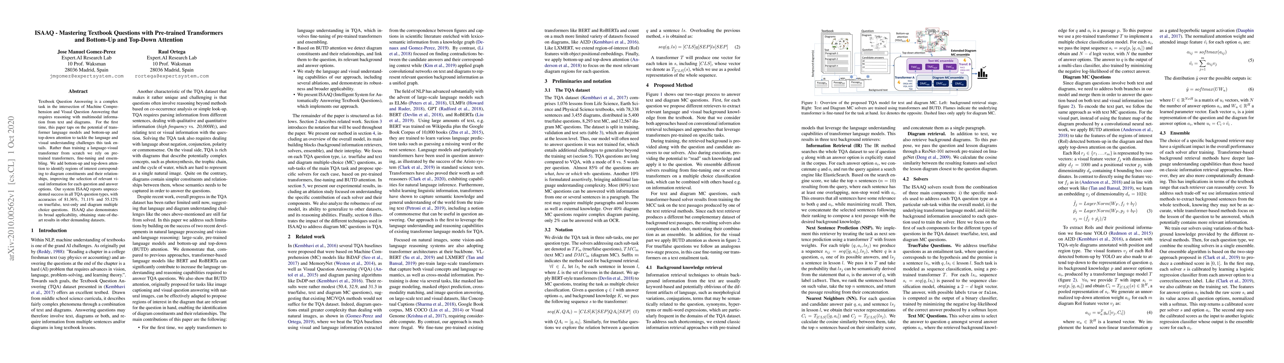 Textbook Question Answering is a complex task in the intersection of Machine Comprehension and Visual Question Answering that requires reasoning with multimodal information from text and diagrams. For the first time, this paper taps on the potential of transformer language models and bottom-up and top-down attention to tackle the language and visual understanding challenges this task entails. Rather than training a language-visual transformer from scratch we rely on pre-trained transformers, fine-tuning and ensembling. We add bottom-up and top-down attention to identify regions of interest corresponding to diagram constituents and their relationships, improving the selection of relevant visual information for each question and answer options. Our system ISAAQ reports unprecedented success in all TQA question types, with accuracies of 81.36%, 71.11% and 55.12% on true/false, text-only and diagram multiple choice questions. ISAAQ also demonstrates its broad applicability, obtaining state-of-the-art results in other demanding datasets.