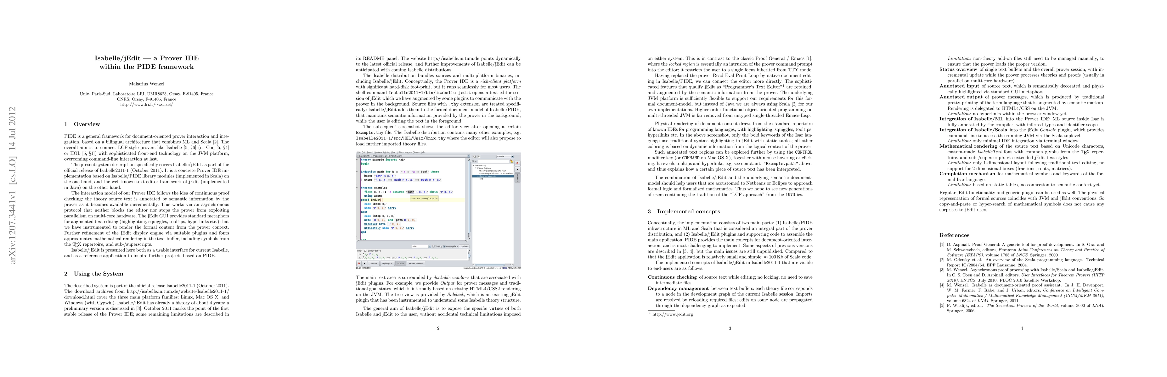 Isabelle/jEdit integrates Isabelle's prover within the jEdit text editor, leveraging the PIDE framework for continuous proof checking and advanced text editing features. This setup aims to enhance the usability of Isabelle by providing a non-blocking, parallel-friendly, and mathematically-rendering interface.