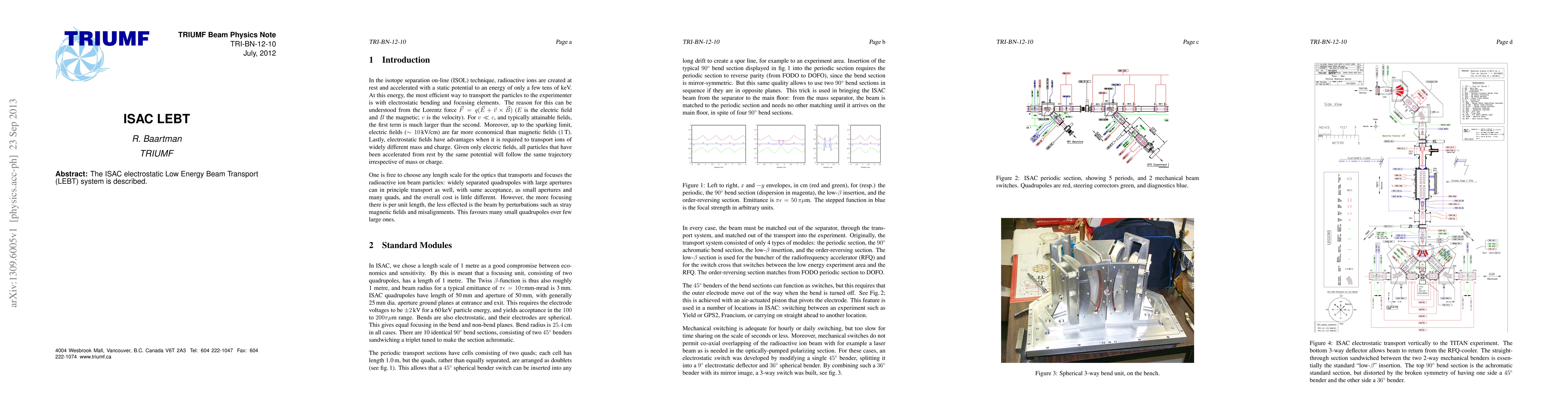 The ISAC electrostatic Low Energy Beam Transport (LEBT) system is described.