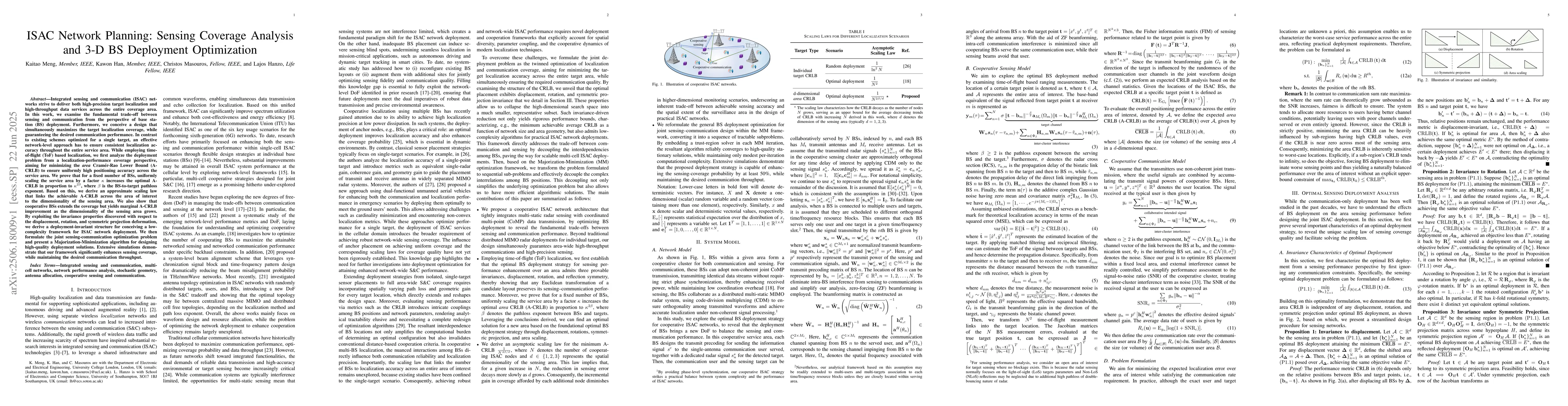 Integrated sensing and communication (ISAC) networks strive to deliver both high-precision target localization and high-throughput data services across the entire coverage area. In this work, we examine the fundamental trade-off between sensing and communication from the perspective of base station (BS) deployment. Furthermore, we conceive a design that simultaneously maximizes the target localization coverage, while guaranteeing the desired communication performance. In contrast to existing schemes optimized for a single target, an effective network-level approach has to ensure consistent localization accuracy throughout the entire service area. While employing time-of-flight (ToF) based localization, we first analyze the deployment problem from a localization-performance coverage perspective, aiming for minimizing the area Cramer-Rao Lower Bound (A-CRLB) to ensure uniformly high positioning accuracy across the service area. We prove that for a fixed number of BSs, uniformly scaling the service area by a factor \kappa increases the optimal A-CRLB in proportion to \kappa^{2\beta}, where \beta is the BS-to-target pathloss exponent. Based on this, we derive an approximate scaling law that links the achievable A-CRLB across the area of interest to the dimensionality of the sensing area. We also show that cooperative BSs extends the coverage but yields marginal A-CRLB improvement as the dimensionality of the sensing area grows.