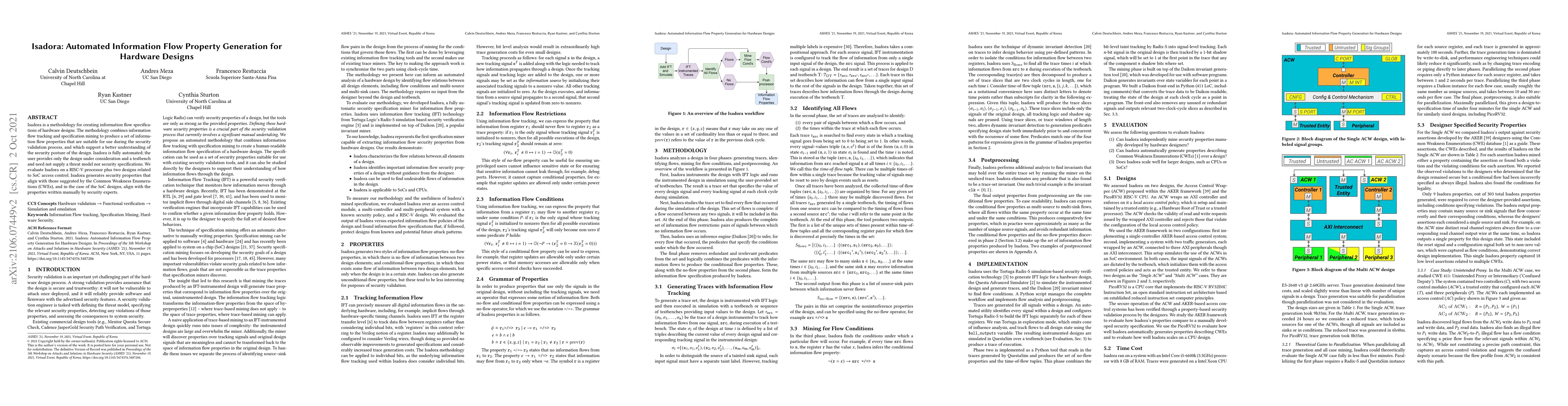 Isadora automates the generation of information flow properties for hardware designs, combining tracking and specification mining to aid security validation. Evaluated on RISC-V and SoC access control designs, it produces properties that match both Common Weakness Enumerations and expert-written specifications.