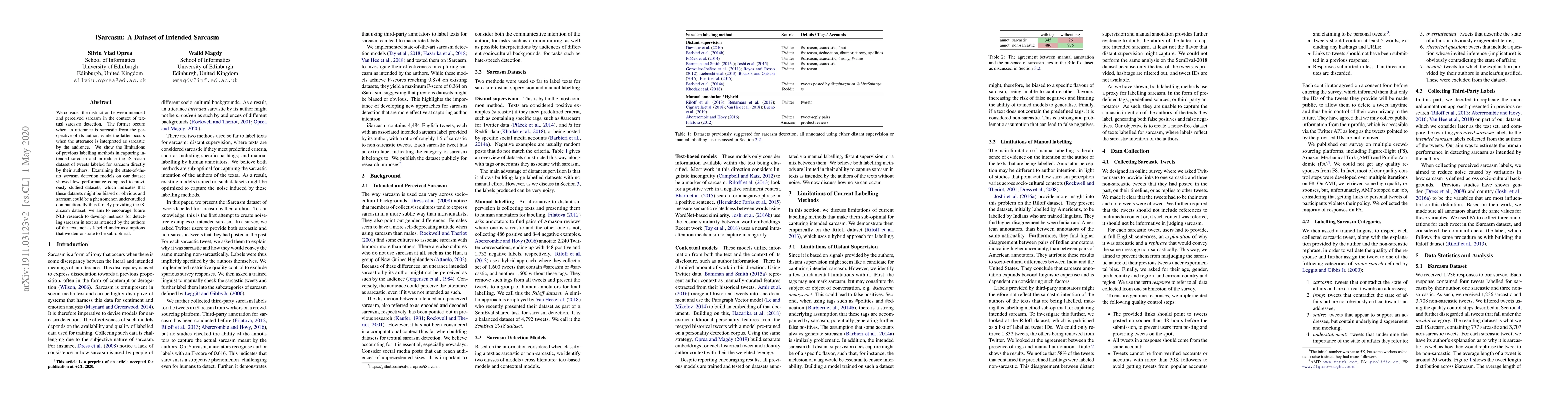 The iSarcasm dataset aims to distinguish between intended and perceived sarcasm in text, addressing limitations in previous sarcasm detection methods. The dataset, labeled by tweet authors, reveals poor performance of current models, suggesting sarcasm detection is under-studied and biased datasets may skew results.
