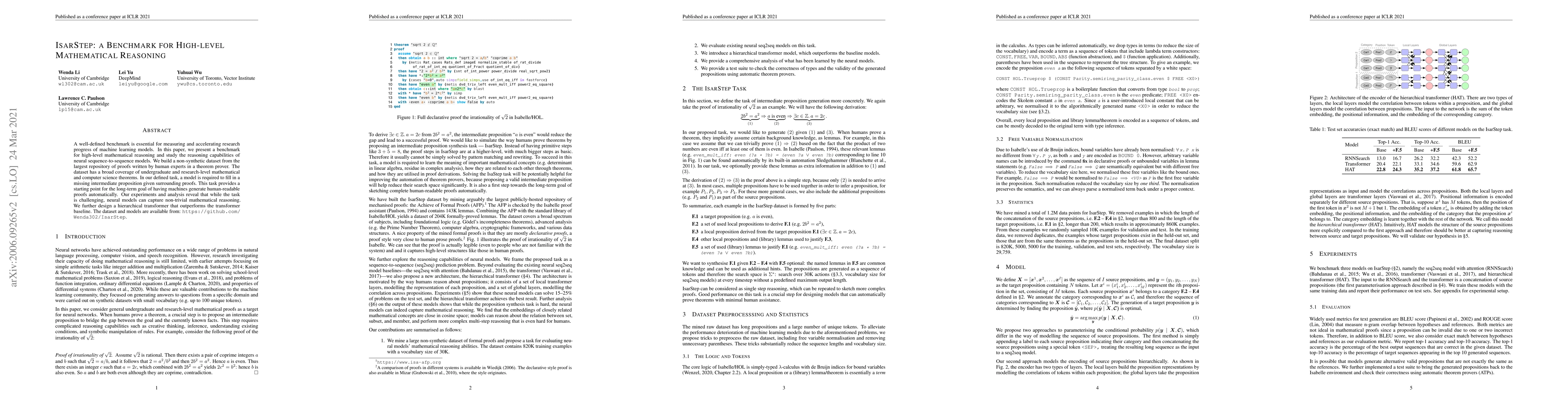 A new benchmark for high-level mathematical reasoning has been created, allowing neural models to fill in missing intermediate propositions in surrounding proofs. Neural models can capture non-trivial mathematical reasoning, with a hierarchical transformer outperforming the baseline.