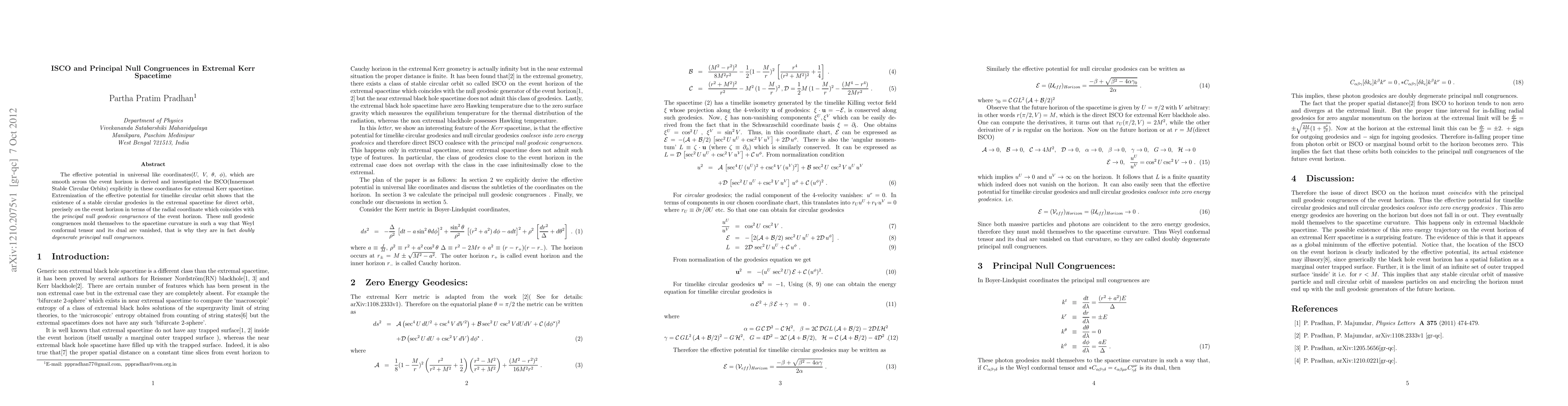 The effective potential in universal like coordinates$(U, V, \theta, \phi)$, which are smooth across the event horizon is derived and investigated the ISCO(Innermost Stable Circular Orbits) explicitly in these coordinates for extremal Kerr spacetime. Extremization of the effective potential for timelike circular orbit shows that the existence of a stable circular geodesics in the extremal spacetime for direct orbit, precisely {\it on} the event horizon in terms of the radial coordinate which coincides with the \emph{principal null geodesic congruences} of the event horizon. These null geodesic congruences mold themselves to the spacetime curvature in such a way that Weyl conformal tensor and its dual are vanished, that is why they are in fact \emph{doubly degenerate principal null congruences}.
