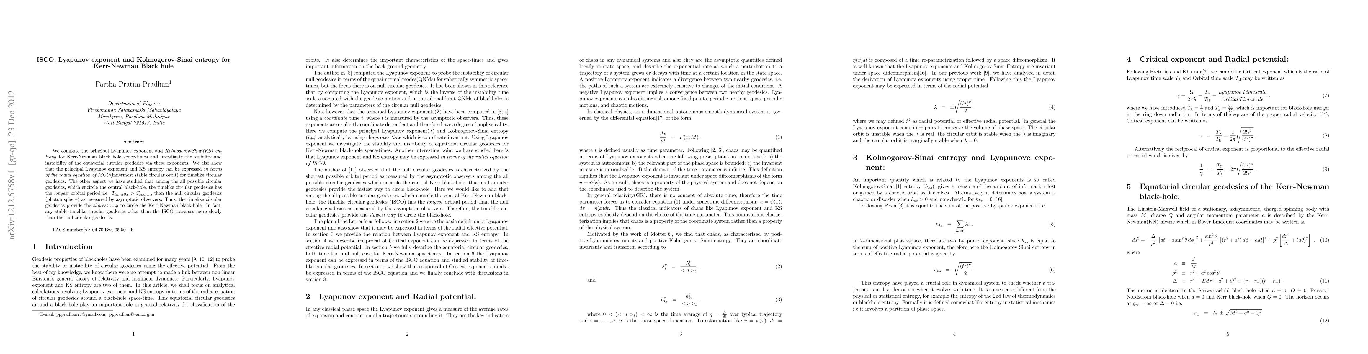 This paper computes the Lyapunov exponent and Kolmogorov-Sinai entropy for Kerr-Newman black holes, linking these to the ISCO and analyzing the stability of equatorial circular geodesics. It finds that timelike circular geodesics have longer orbital periods than null geodesics, indicating the slowest way to circle the black hole.