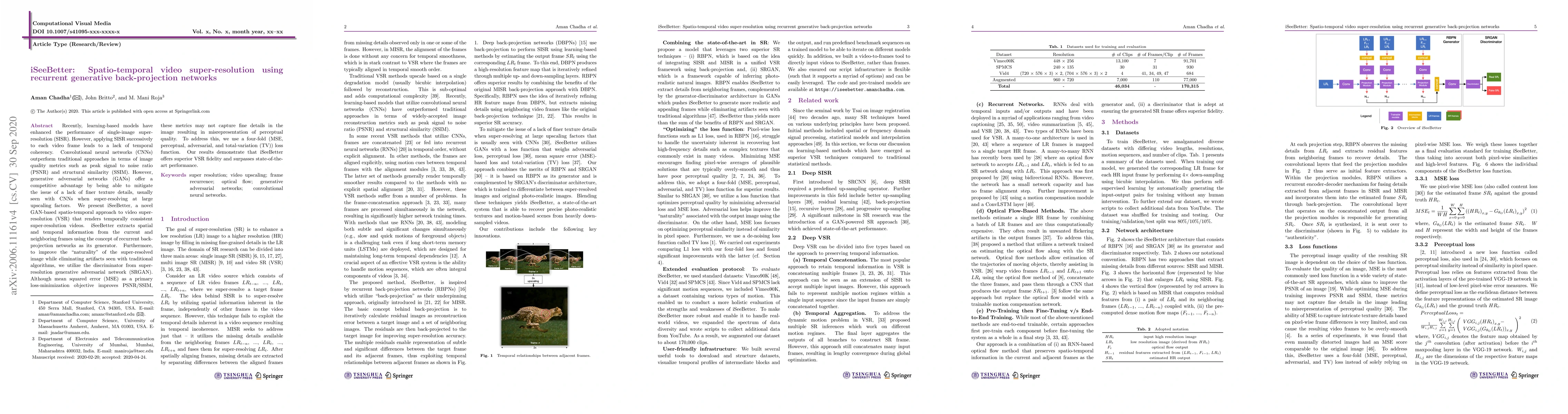iSeeBetter introduces a novel GAN-based spatio-temporal approach for video super-resolution, leveraging recurrent back-projection networks to extract spatial and temporal information for temporally consistent results. It employs a multi-loss function to enhance perceptual quality and outperforms existing methods in VSR fidelity.