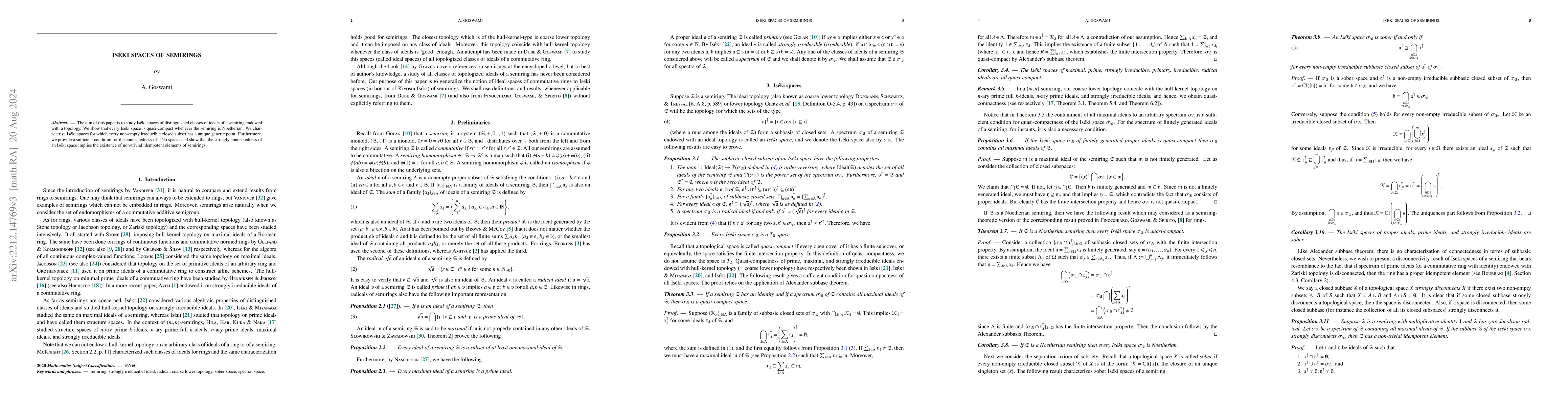 This paper investigates Iseki spaces of semirings with topological structures, proving that quasi-compactness holds for Iseki spaces when the semiring is Noetherian. It also characterizes Iseki spaces where every non-empty irreducible closed subset has a unique generic point and discusses conditions for their connectedness.