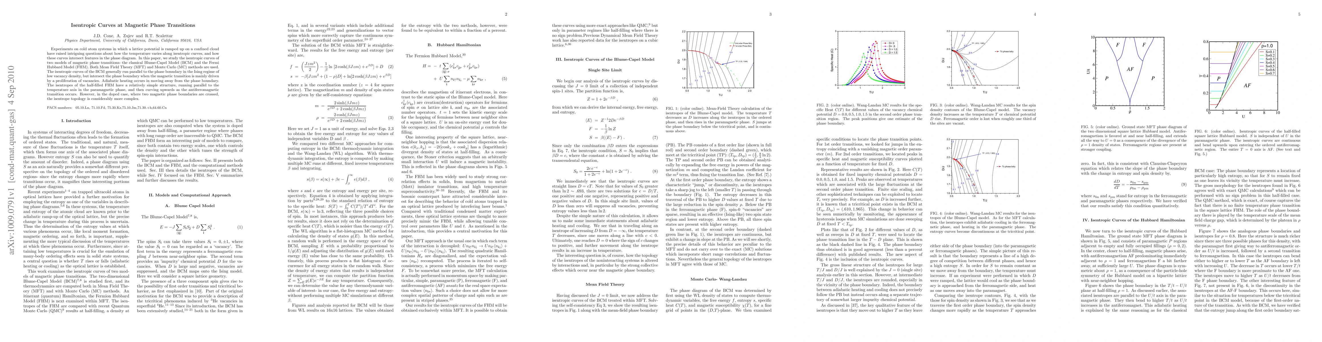 This paper explores isentropic curves in magnetic phase transitions using Mean Field Theory and Monte Carlo methods. In the Blume-Capel Model, isentropic curves parallel the phase boundary in low vacancy density but intersect it with vacancy-driven transitions. Adiabatic heating occurs away from the boundary. The Fermi Hubbard Model's isentropic curves are simple in the paramagnetic phase but complex when crossing doped magnetic phase boundaries.