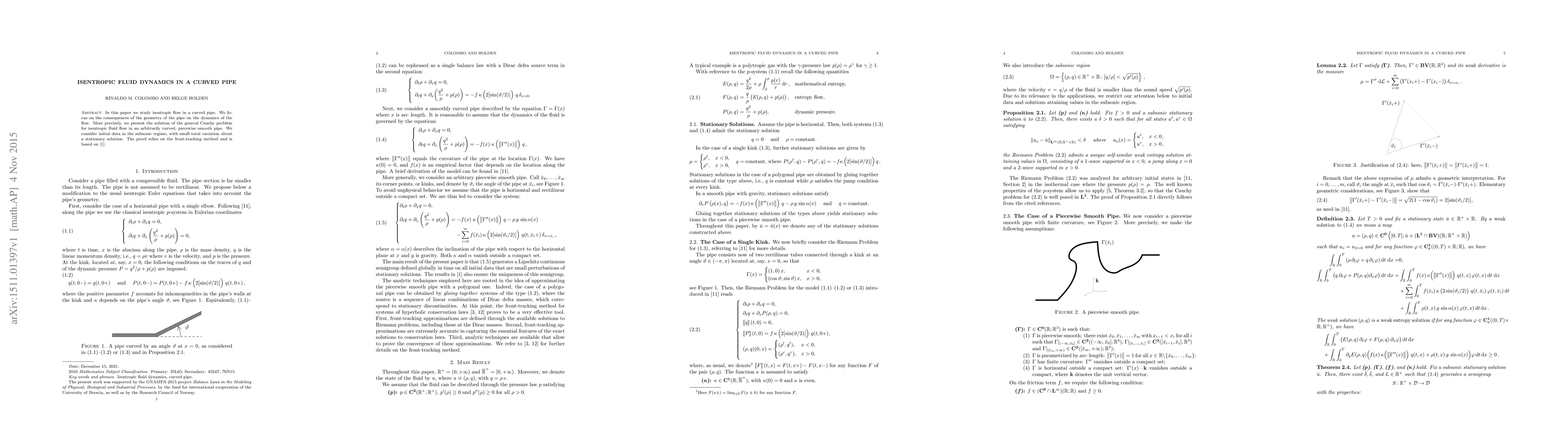 In this paper we study isentropic flow in a curved pipe. We focus on the consequences of the geometry of the pipe on the dynamics of the flow. More precisely, we present the solution of the general Cauchy problem for isentropic fluid flow in an arbitrarily curved, piecewise smooth pipe. We consider initial data in the subsonic regime, with small total variation about a stationary solution. The proof relies on the front-tracking method and is based on [1].