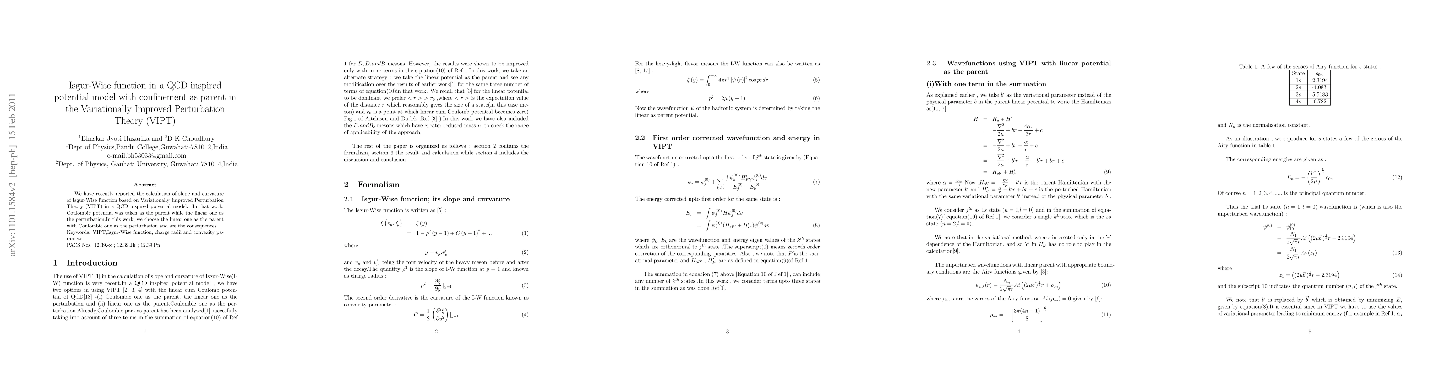 This paper investigates the Isgur-Wise function in a QCD-inspired potential model using Variationally Improved Perturbation Theory (VIPT), with the linear potential as the parent and the Coulombic potential as the perturbation, contrasting previous work where the roles were reversed. Keywords include VIPT, Isgur-Wise function, charge radii, and convexity parameter.