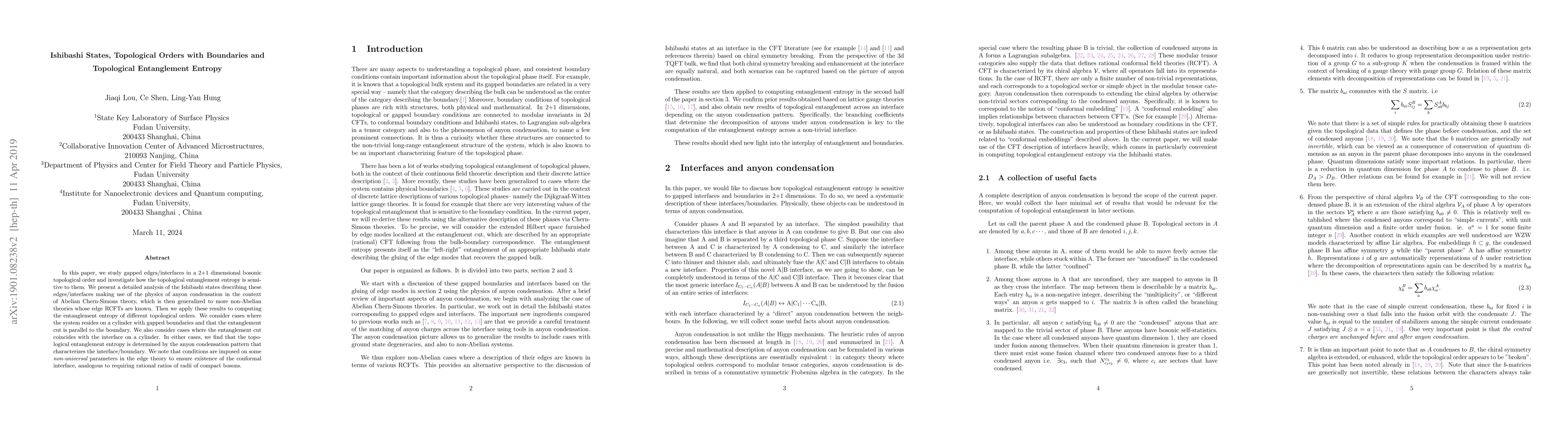 This paper explores the topological entanglement entropy in 2+1D bosonic topological orders with gapped edges and interfaces, analyzing Ishibashi states using Abelian Chern-Simons theory and extending it to non-Abelian theories. It finds that the entanglement entropy is determined by the anyon condensation pattern characterizing the interface/boundary.