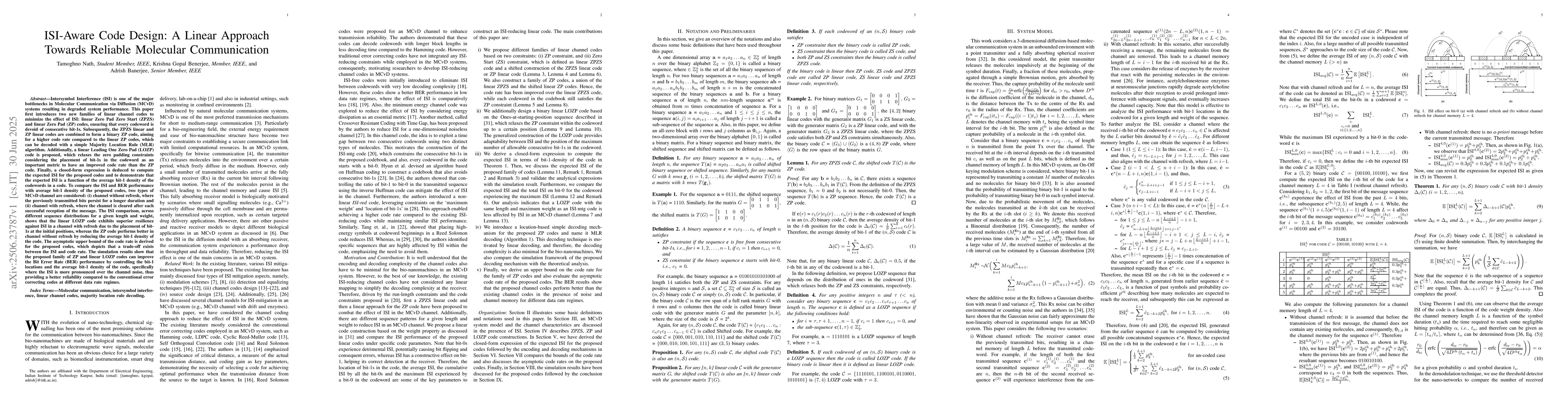 This research introduces linear ZPZS and ZP codes to combat ISI in Molecular Communication via Diffusion, enhancing reliability. A Leading One Zero Pad (LOZP) code is also proposed, outperforming in refresh channels due to strategic bit-1 placement, while ZP excels without refresh, controlling bit-1 positions and density for improved Bit Error Rate (BER) in ISI-dominated regimes.
