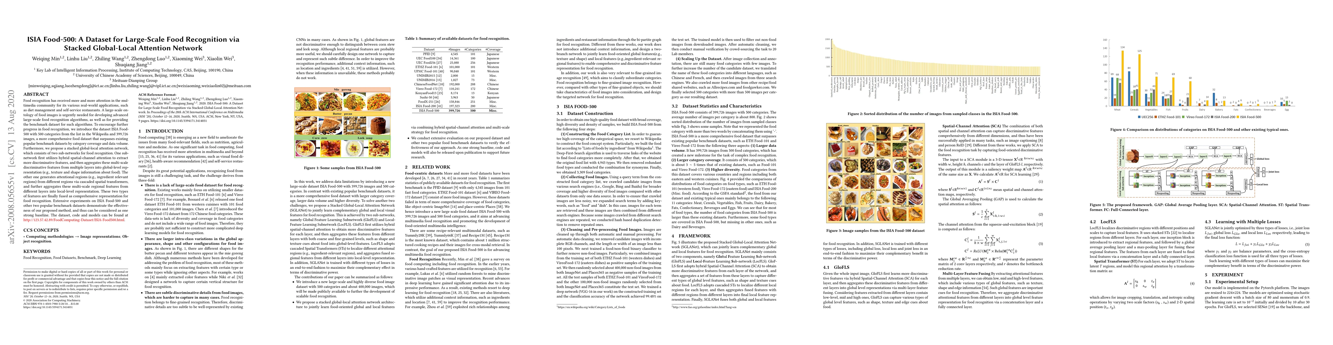 The ISIA Food-500 dataset, featuring 500 food categories and 399,726 images, aims to advance large-scale food recognition research. The authors propose a stacked global-local attention network that leverages hybrid spatial-channel attention and cascaded spatial transformers to extract discriminative features, demonstrating superior performance on the new dataset and existing benchmarks.